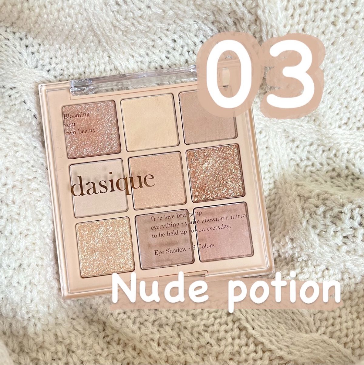 dasiqueシャドウパレット03ヌードポーション誰でも使いやすい色味のベージュです!ヌードカラーが盛り込まれていて、ナチュラルメイクにはもってこいです☺️目の周りの陰影を上手く作りやすく、濃すぎて失敗した!ということが起こりにくいのがこのパ...