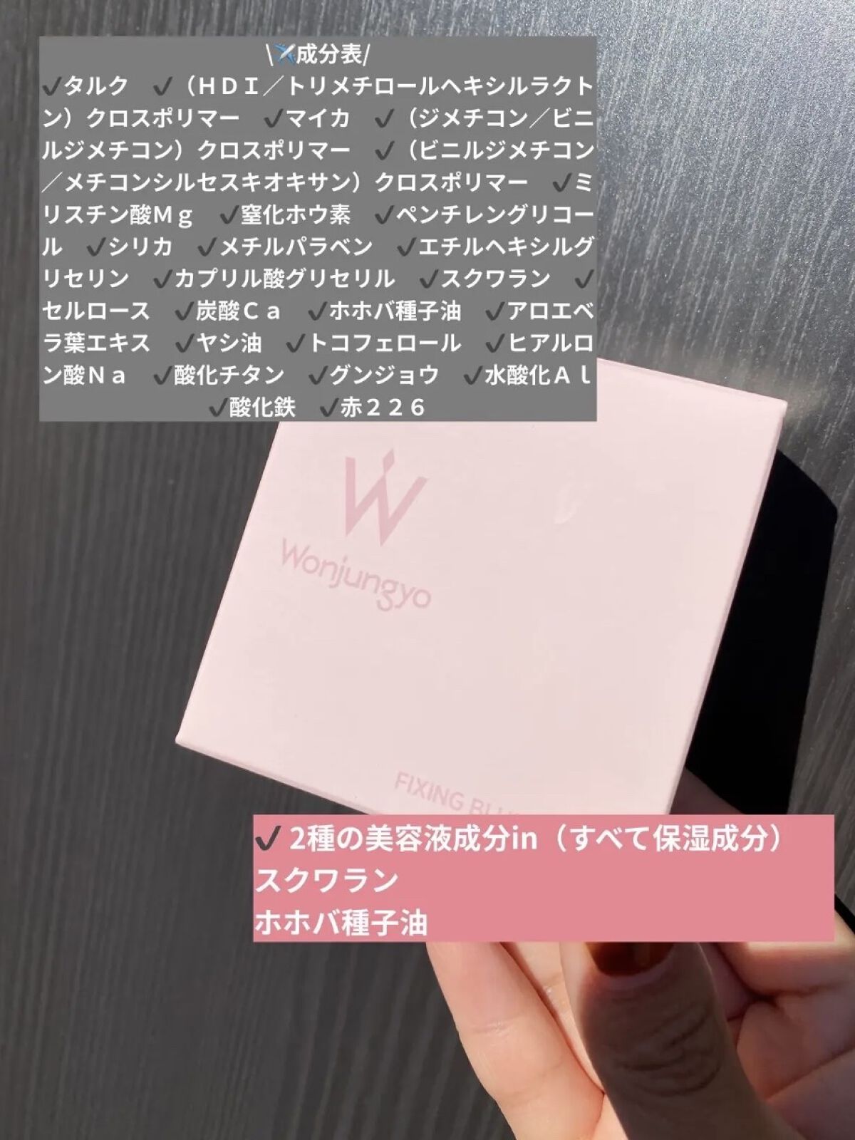 ピンクのパケが可愛い💓 *美容液成分in スクワラン、ホホバ種子油、モモ葉エキスを配合(すべて保湿成分)。 *ふんわり質感の球状パウダーでふんわりとなめらか肌に仕上げてくれる。 化粧崩れ防止処方 ・エモリエントパウダー ヒアルロン酸Na*2とアロエベラ葉エキス*2でパウダーをコーティング。