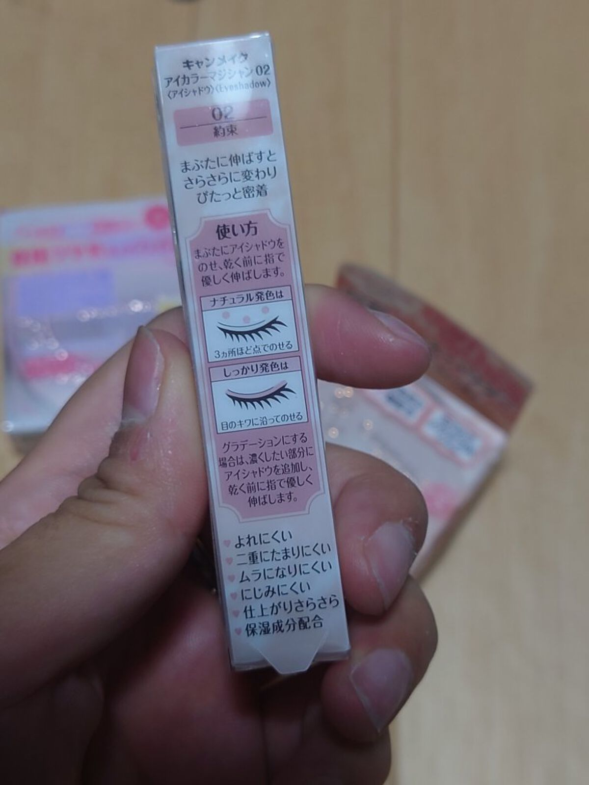 キャンメイクの中で新作のアイカラーマジシャン、その中でも淡いピンクのラメが特徴の約束を買いました! これは速乾性で、まぶたの上で伸ばしたあとはすぐ乾くから気にならない! そして涙袋にも使えちゃうんです!! 塗るところはモケモケになっていてとっても塗りやすかったです!