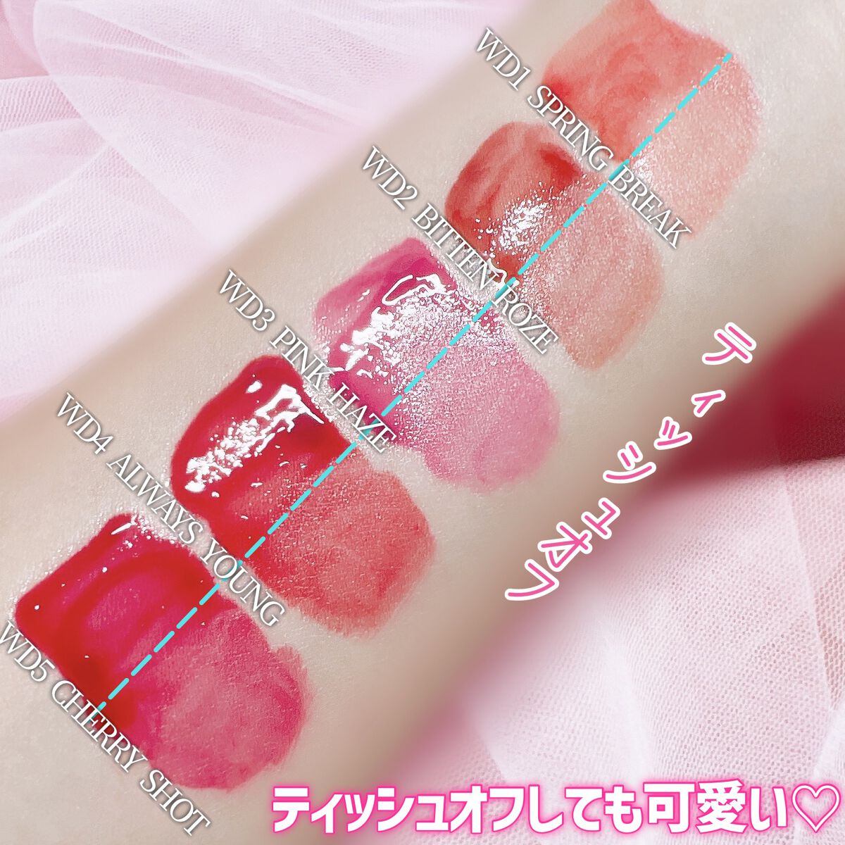 - <WD2 ビトゥン ローズ> 水、ジフェニルジメチコン、リンゴ酸ジイソステアリル、ビスジグリセリルポリアシルアジペート-2、水添ポリイソブテン、ジグリセリン、DPG、セチルPEG/PPG-10/1ジメチコン、イソステアリン酸ソルビタン、ポリソルベート60、ペンチレングリコール、オクチルドデカノール、セテアレス-20、(アクリル酸ヒドロキシエチル/アクリロイルジメチルタウリンNa)コポリマー、スクワラン、フェノキシエタノール、ポリグリセリン-3、ステビオシド、香料、エチルヘキシルグリセリン、グリセリン、シア脂、ツバキ種子油、トリ(カプリル酸/カプリン酸)グリセリル、アルガニアスピノサ核油、ホホバ種子油、アーモンド油、アンズ核油、月見草油、オリーブ果実油、テトラ(ジ-t-ブチルヒドロキシヒドロケイヒ酸)ペンタエリスリチル、カニナバラ果実エキス、マンゴー果実エキス、赤104(1)、赤227、黄5、青1 <WD3 ピンク ヘイズ> 水、ジフェニルジメチコン、リンゴ酸ジイソステアリル、ビスジグリセリルポリアシルアジペート-2、水添ポリイソブテン、ジグリセリン、DPG、セチルPEG/PPG-10/1ジメチコン、イソステアリン酸ソルビタン、ポリソルベート60、ペンチレングリコール、オクチルドデカノール、セテアレス-20、(アクリル酸ヒドロキシエチル/アクリロイルジメチルタウリンNa)コポリマー、スクワラン、フェノキシエタノール、ポリグリセリン-3、ステビオシド、香料、エチルヘキシルグリセリン、グリセリン、水酸化Al、ポリアクリル酸アンモニウム、BG、アルガニアスピノサ核油、シア脂、ツバキ種子油、トリ(カプリル酸/カプリン酸)グリセリル、アーモンド油、アンズ核油、ホホバ種子油、月見草油、オリーブ果実油、テトラ(ジ-t-ブチルヒドロキシヒドロケイヒ酸)ペンタエリスリチル、マンゴー果実エキス、カニナバラ果実エキス、酸化チタン、赤104(1)、赤227、黄5、青1 <WD4 オールウェイズ ヤング> 水、ジフェニルジメチコン、リンゴ酸ジイソステアリル、ビスジグリセリルポリアシルアジペート-2、水添ポリイソブテン、ジグリセリン、DPG、セチルPEG/PPG-10/1ジメチコン、イソステアリン酸ソルビタン、ポリソルベート60、ペンチレングリコール、オクチルドデカノール、セテアレス-20、(アクリル酸ヒドロキシエチル/アクリロイルジメチルタウリンNa)コポリマー、スクワラン、フェノキシエタノール、ポリグリセリン-3、ステビオシド、香料、エチルヘキシルグリセリン、グリセリン、シア脂、ツバキ種子油、トリ(カプリル酸/カプリン酸)グリセリル、アルガニアスピノサ核油、ホホバ種子油、アーモンド油、アンズ核油、月見草油、オリーブ果実油、テトラ(ジ-t-ブチルヒドロキシヒドロケイヒ酸)ペンタエリスリチル、カニナバラ果実エキス、マンゴー果実エキス、赤104(1)、赤227、黄5、青1 <WD6 クラッシュド パンプキン> 水、水添ポリイソブテン、リンゴ酸ジイソステアリル、ビスジグリセリルポリアシルアジペート-2、ジフェニルシロキシフェニルトリメチコン、ジフェニルジメチコン、ポリグリセリン-3、オクチルドデカノール、ポリソルベート60、セチルPEG/PPG-10/1ジメチコン、ラウリン酸ポリグリセリル-10、ペンチレングリコール、1,2-ヘキサンジオール、(アクリル酸ヒドロキシエチル/アクリロイルジメチルタウリンNa)コポリマー、PEG-60水添ヒマシ油、セテアリルアルコール、スクワラン、キシリトール、エチルヘキシルグリセリン、香料、ポリアクリル酸アンモニウム、イソステアリン酸ソルビタン、水酸化Al、フェノキシエタノール、BG、トコフェロール、酸化チタン、酸化鉄、赤227、黄4、黄5、青1 <WD8 ビンテージ カラント> 水、水添ポリイソブテン、リンゴ酸ジイソステアリル、ビスジグリセリルポリアシルアジペート-2、ジフェニルシロキシフェニルトリメチコン、ジフェニルジメチコン、オクチルドデカノール、ポリグリセリン-3、ポリソルベート60、セチルPEG/PPG-10/1ジメチコン、ラウリン酸ポリグリセリル-10、1,2-ヘキサンジオール、ペンチレングリコール、(アクリル酸ヒドロキシエチル/アクリロイルジメチルタウリンNa)コポリマー、PEG-60水添ヒマシ油、セテアリルアルコール、スクワラン、キシリトール、エチルヘキシルグリセリン、香料、イソステアリン酸ソルビタン、トコフェロール、赤104(1)、赤227、黄5、青1 <WD9 ミスター ストレンジャー> 水、水添ポリイソブテン、リンゴ酸ジイソステアリル、ビスジグリセリルポリアシルアジペート-2、ジフェニルシロキシフェニルトリメチコン、ジフェニルジメチコン、オクチルドデカノール、ポリグリセリン-3、ポリソルベート60、セチルPEG/PPG-10/1ジメチコン、ラウリン酸ポリグリセリル-10、1,2-ヘキサンジオール、ペンチレングリコール、(アクリル酸ヒドロキシエチル/アクリロイルジメチルタウリンNa)コポリマー、セテアリルアルコール、PEG-60水添ヒマシ油、スクワラン、キシリトール、エチルヘキシルグリセリン、香料、イソステアリン酸ソルビタン、水酸化Al、ポ