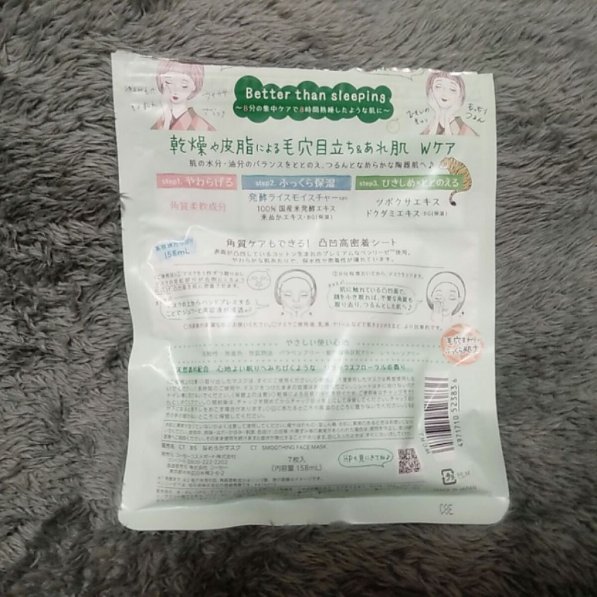 当方、めちゃめちゃオイリー肌で、洗顔と化粧水は独特なおかっぱ女の子のロゴで有名お米シリーズを使っております。 そのシリーズのお米のシートマスクを初めて購入して使い終わったけど次どうしようかな~~という時に今度はこっちにしようと思って買いました。 オイリー肌かつ毛穴が気になる主にはシートの表面に凹凸があるのが効いたらしく、剥がしたらとてもふっくらしました! 8分の集中ケアで8時間熟睡したような肌にというキャッチコピーの元、パックは10分弱貼っておきました。 マスクに突起部分があるので裏表も分かりやすいです!顔のサイズに合うシートマスクなんてないしと諦めてる主でしたが薄いので密着させやすいし剥がれない!