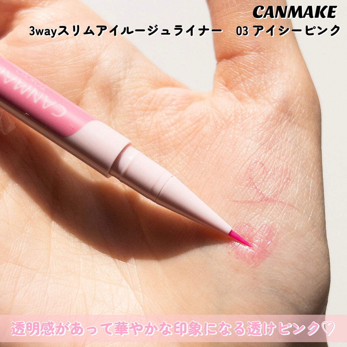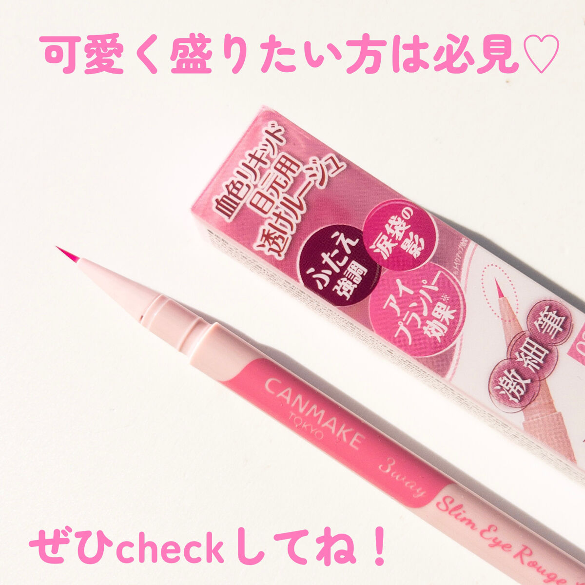 - ふたえ強調・涙袋の影・アイプランパー効果(※)に使える 激細筆の目元用透けルージュライナー 自然でリアルな血色を叶える、絶妙な透け発色ライナー♥ まるで目元にルージュを塗ったかのように血色感を与え、かわいい印象に仕上がります。 描いた線が太くならないよう、筆を根元から細くして 描きやすい距離と適度なコシになるように、短い筆に仕上げました。 汗・皮脂・こすれに強く、朝描いたラインも長時間キープされます。 (※メイクアップ効果による)