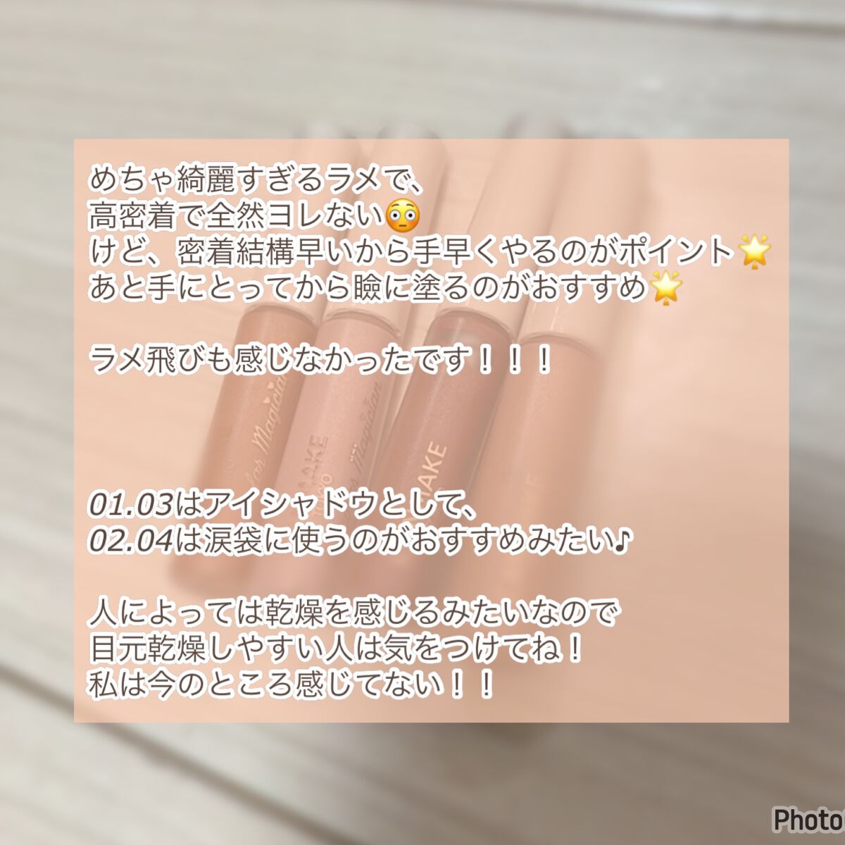 - リッチな輝きが長時間続く サラサラ仕上げのリキッドアイシャドウ 塗り心地はみずみずしくなめらかなのに、伸ばしていくうちにサラサラに変わる 魔法みたいなリキッドアイシャドウ♡ 速乾だからヨレにくく、ふたえのラインにたまりにくい! リキッドアイシャドウならではの輝きが長時間続きます。