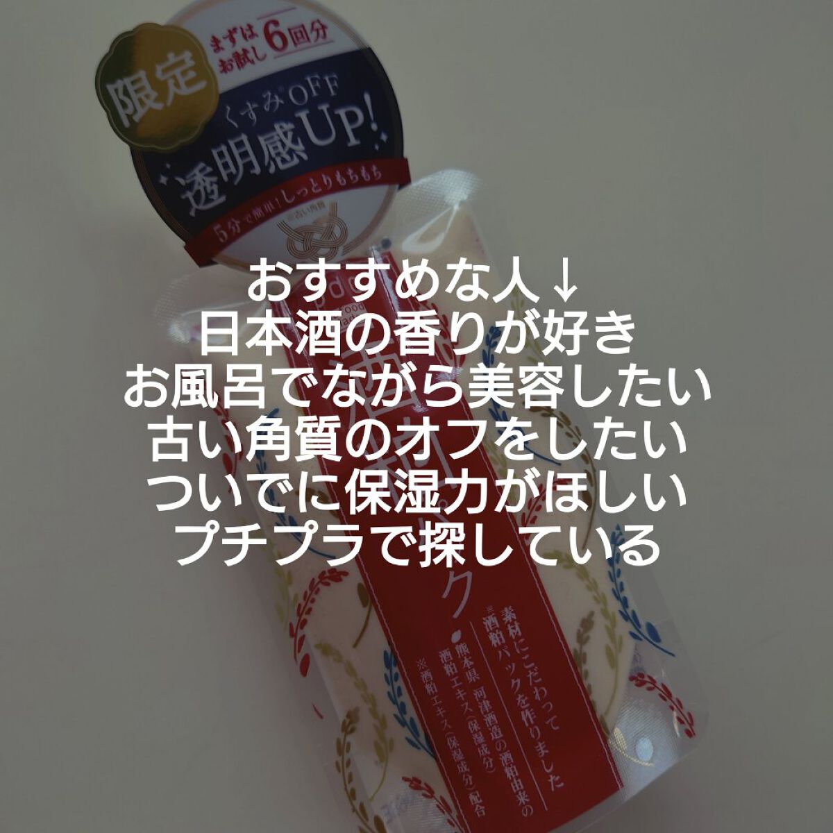 - オリジナル酒粕エキス配合の洗い流しパックがリニューアル!くすみ(古い角質)OFF透明感UP!! おうちで簡単に酒粕パックが楽しめます。 酒粕=酒粕エキス(保湿成分)配合