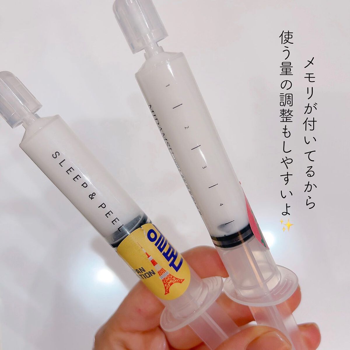 ピーリング・角質・鎮静 眠っている間にケアできる 低刺激なスリーピングマスク☾·̩͙ AHA&BHA成分が毛穴を塞いでしまっている角質を柔らかく溶かして皮脂がスムーズに排出されるようサポート 毛穴・角質ケア、ニキビ・吹き出物、毛穴収れんに◎ 容器が注射器みたいになっていて、少量ずつ出しやすいのが助かります💉 吹き出物には韓国処方 顔全体へのピーリングには日本処方 ピーリングして翌朝洗顔すると肌つるんと滑らか🥚⸝⋆ メントールの軽くスースーする感じも清涼感控えめで、痛み等なく、私は全く刺激も感じてません! ピーリングしてるのに、乾燥やつっぱりがないところも好きです♡♡ 日本処方と韓国処方、ほぼ同じで大きな違いはなし 使用感もよくて、私には効果もあったので生理前の肌荒れ等、いざという時に常備しておきたいスキンケアです💉✨
