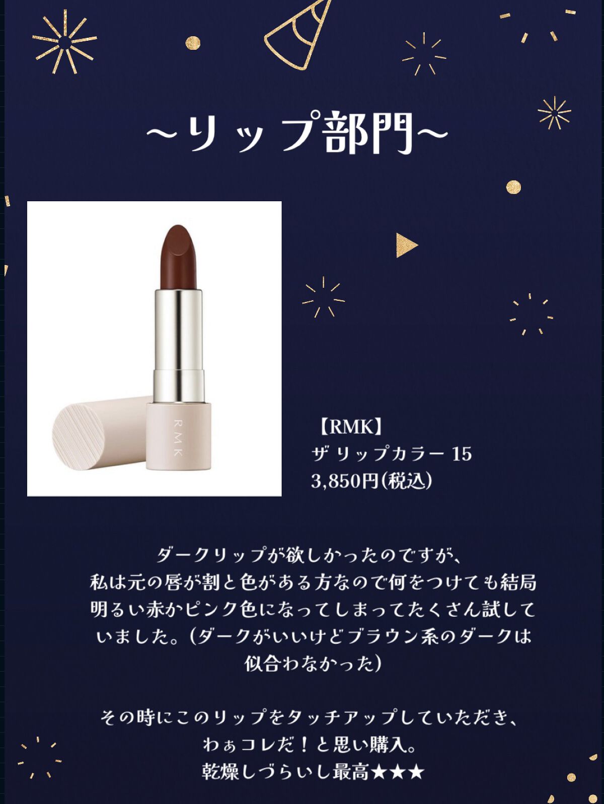 | 口紅・グロス・リップライナーランキング第1位 | スルスル塗れて下地やリップクリームなしでも綺麗に色づきます♪ | 詳細を見る | |