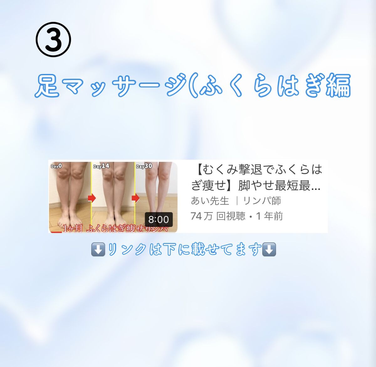 ***************** ①体を温める!(←これめっちゃ大事‼︎ 湯船に約15分ほど浸かる。ついでに足のマッサージもすれば一石二鳥🤞🏻もしくは湯桶で足湯をして約20分もOKです🙆🏻♀️私は時間が無いときは湯桶で足湯をしながら体を洗っています笑 ②足マッサージ(足裏,足首編 この動画の前半部分だけマッサージします⬇️ ③足マッサージ(ふくらはぎ編 この動画の通りにマッサージ5分間します⬇️ 私は最初の頃、全然効かなかったんですが毎日続けることによってマッサージも効く足になり以前よりも浮腫みづらくなりました! これを習慣化することでさらに足が浮腫みずらくなるのでみなさんも頑張って続けてみてください🤍