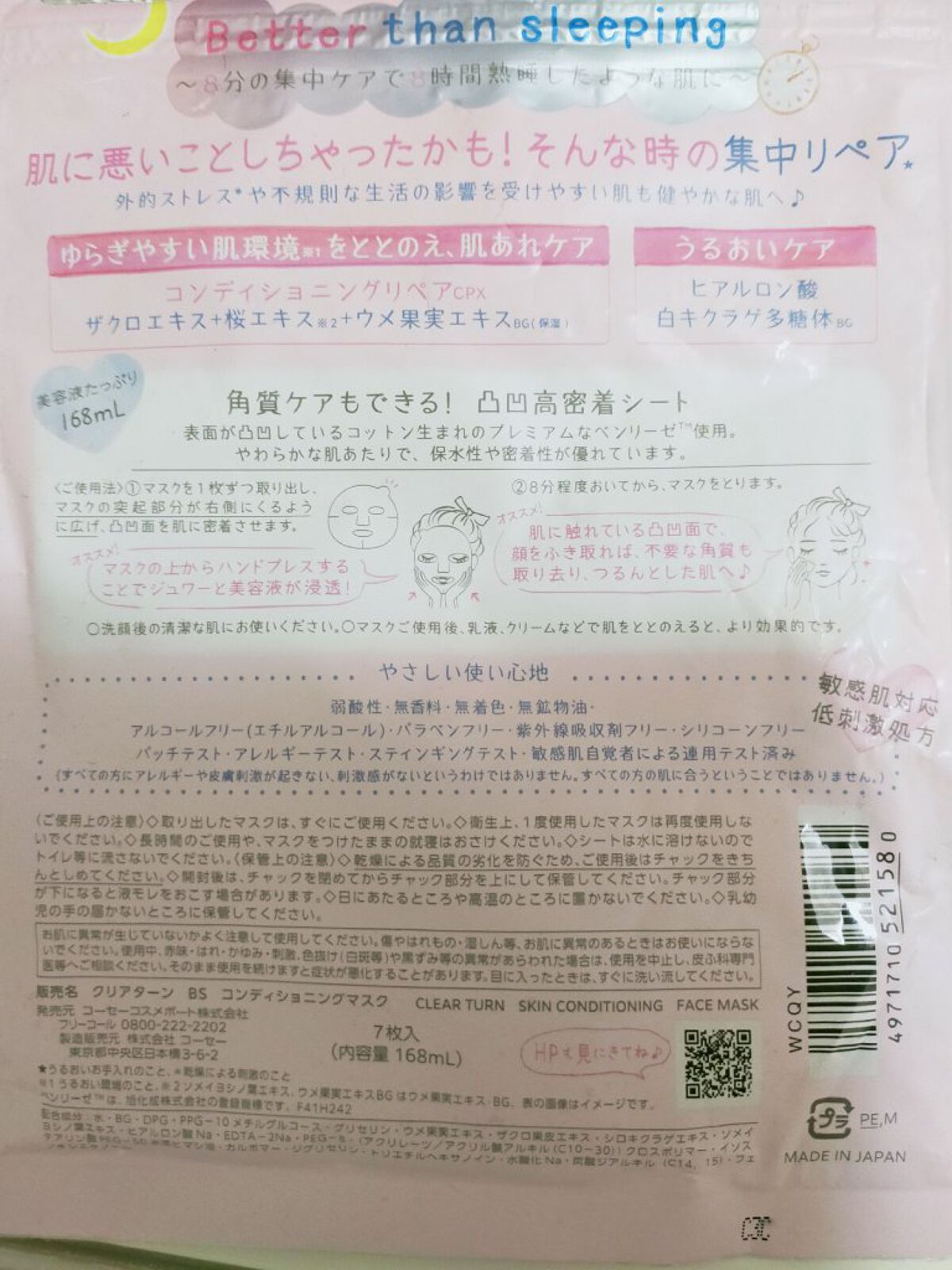 - 【クリアターン ごめんね素肌マスク】 負担をかけて、あれてしまった肌の素肌環境※1をととのえる“速攻集中リペア※2マスク”です。 ① あれがちな肌を素早くコンディションケア! ザクロエキス、桜エキス※3、ウメ果実エキスBG配合し、ゆらぎやすい肌環境をととのえ、肌あれをケアします。また、うるおいケア成分として、ヒアルロン酸、白キクラゲ多糖体BGを配合。外的ストレス※4や不規則な生活の影響を受けやすい肌も健やかでゆらぎにくい肌へみちびきます。 ②敏感肌も使える、弱酸性・低刺激処方 無香料・無着色・無鉱物油・アルコールフリー(エチルアルコール)・パラベンフリー・紫外線吸収剤フリー・シリコーンフリー・パッチテスト済み・アレルギーテスト済み・スティンギングテスト済み・敏感肌自覚者による連用テスト済み(すべての方にアレルギーや皮膚刺激が起きない、刺激感がないというわけではありません。すべての方の肌に合うということではありません。) ③角質ケアもできる!凸凹高密着シート コットン生まれのやわらかな肌触りのベンリーゼを使用。 表面に凸凹のエンボス加工を施しているため、密着性が高く、はがしたマスクでやさしく顔をふきとることで角質ケアもできます。 ※1 うるおい環境のこと ※2 うるおいお手入れのこと ※3 ソメイヨシノ葉エキス、ウメ果実エキスBGはウメ果実エキス・BG(保湿) ※4 乾燥による刺激のこと
