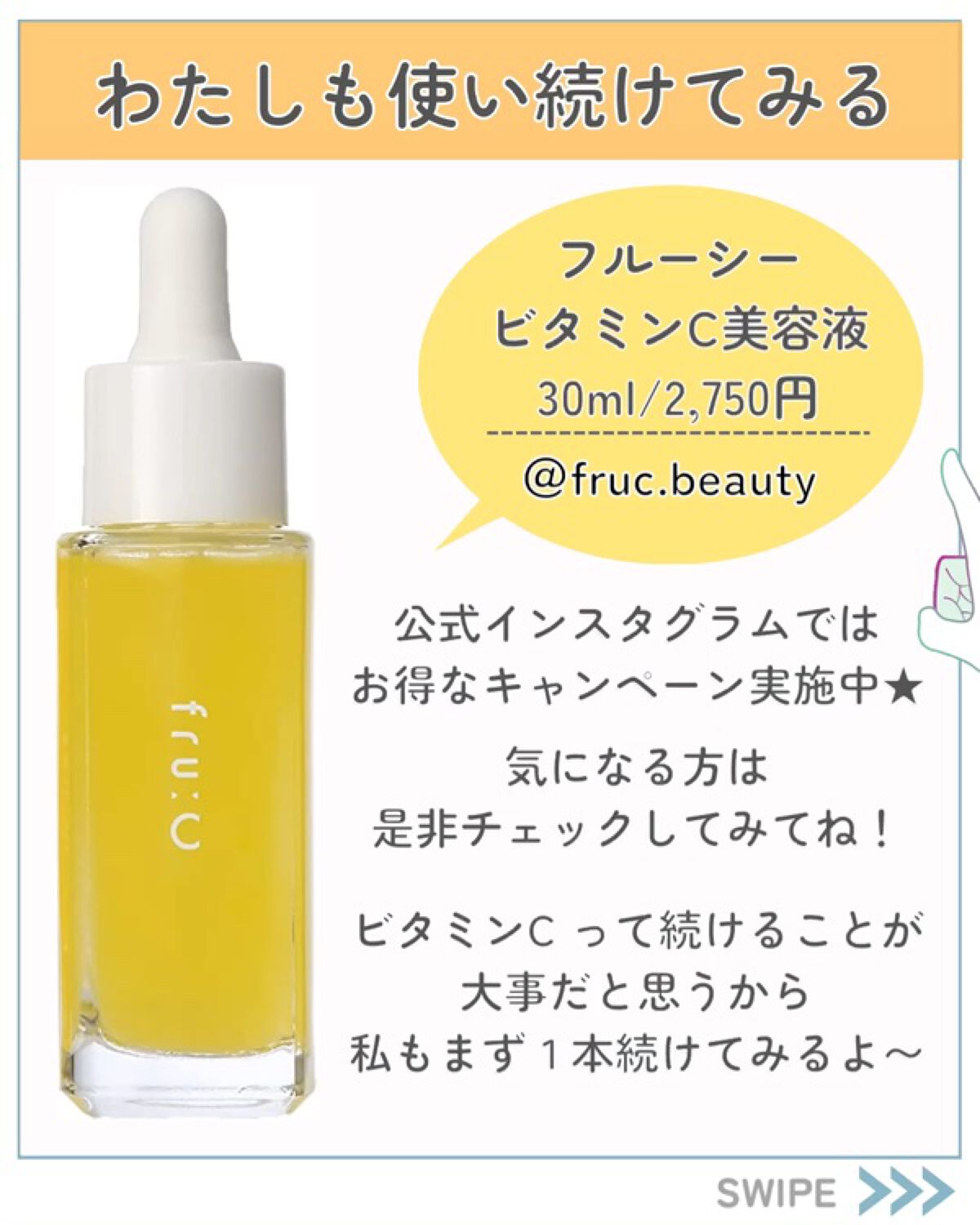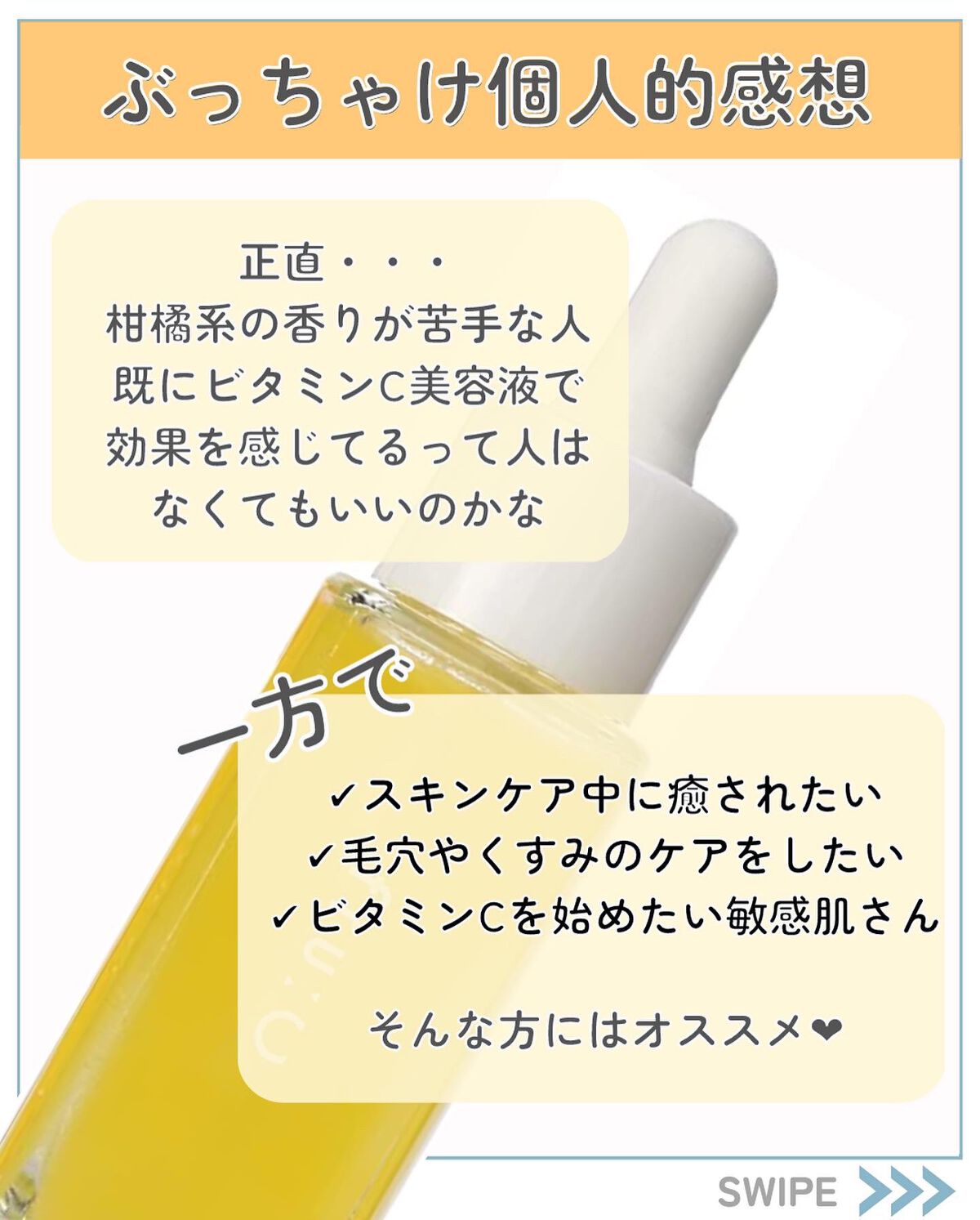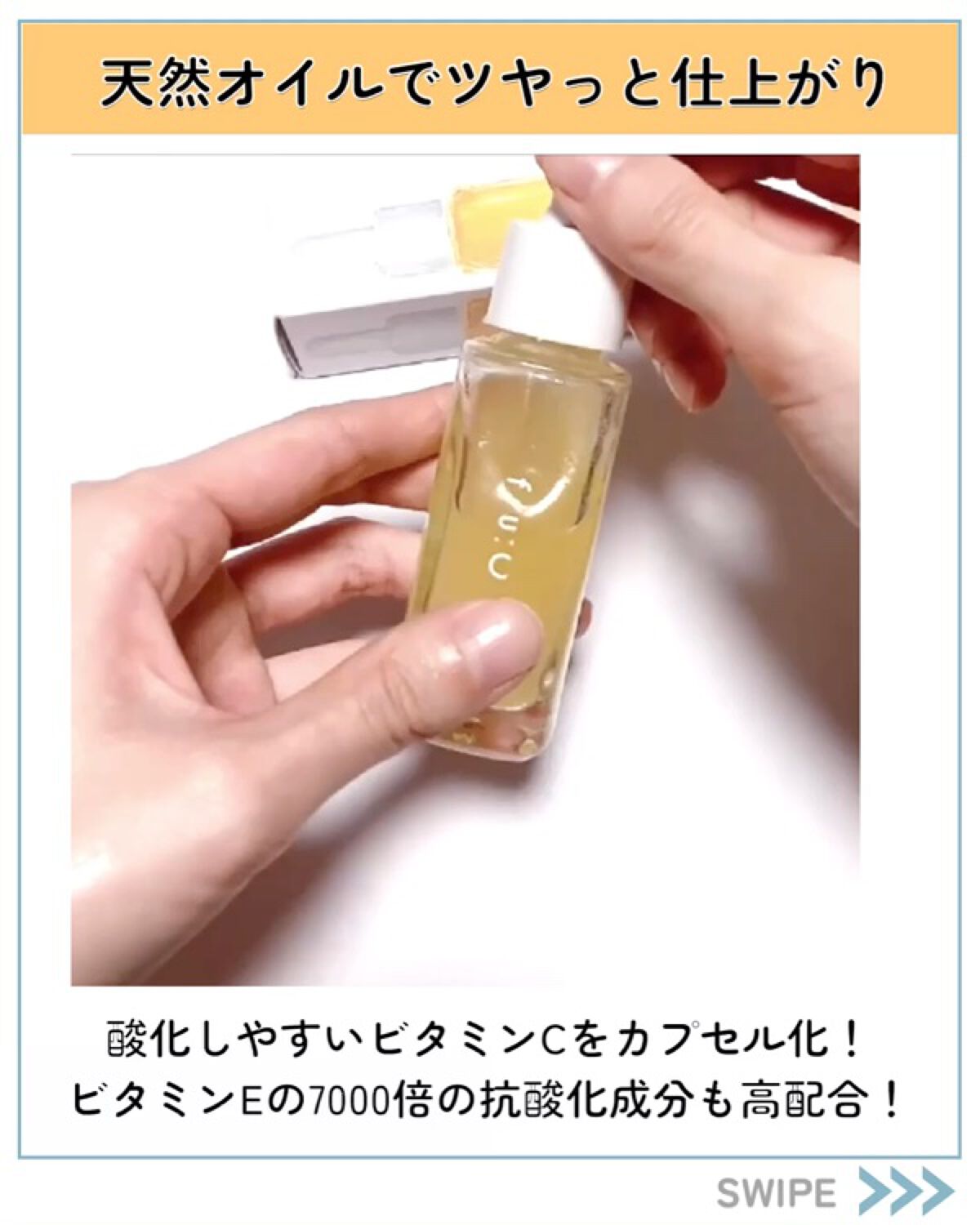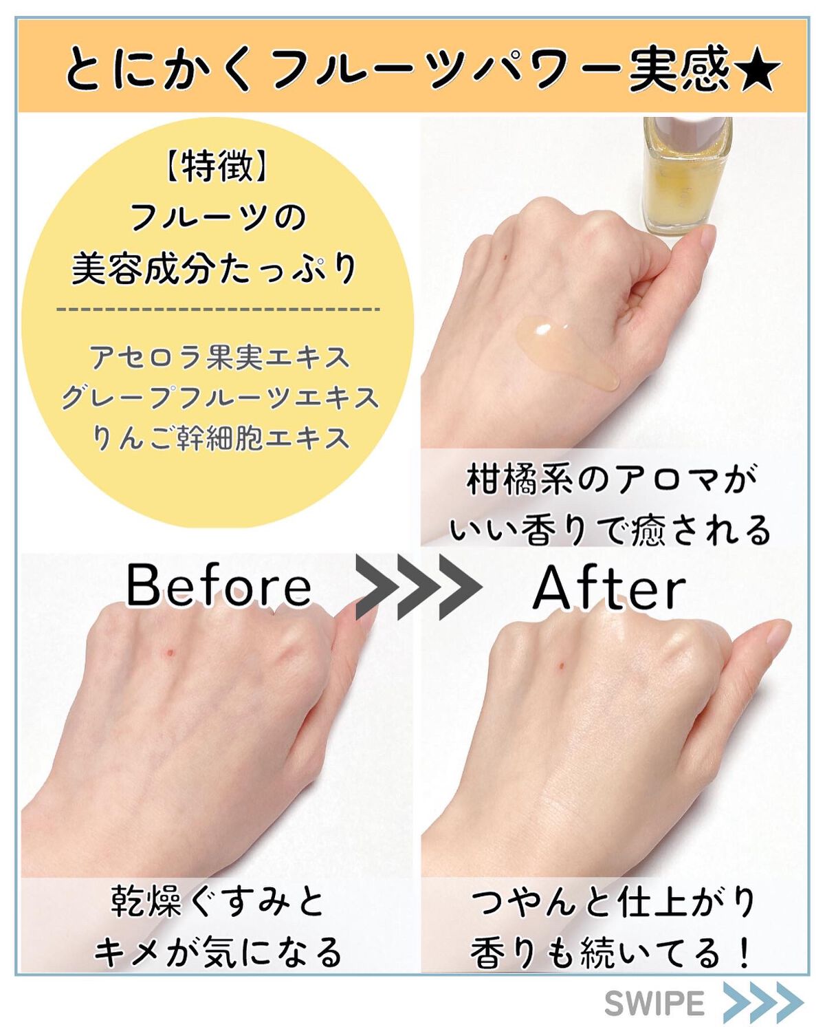 - 美容成分を追求し、たどり着いたフルーツの力とビタミンCの力。 その力を凝縮し誕生した1本4役のビタミンC美容液。 壊れやすいビタミンC*を、独自処方の『ホワイトCカプセル*』でギュッと閉じ込めました。 肌に触れた瞬間カプセルがはじけ新鮮なビタミンC*が肌に広がります。 さらに、厳選のフルーツエキスが肌に潤いを与え透明感あふれる肌に導きます。 1本で「化粧液×美容液×オイル×乳液」の4つの機能。 天然のフルーツアロマの芳醇な香りでスキンケアの時間が癒しの時間に。 *整肌成分