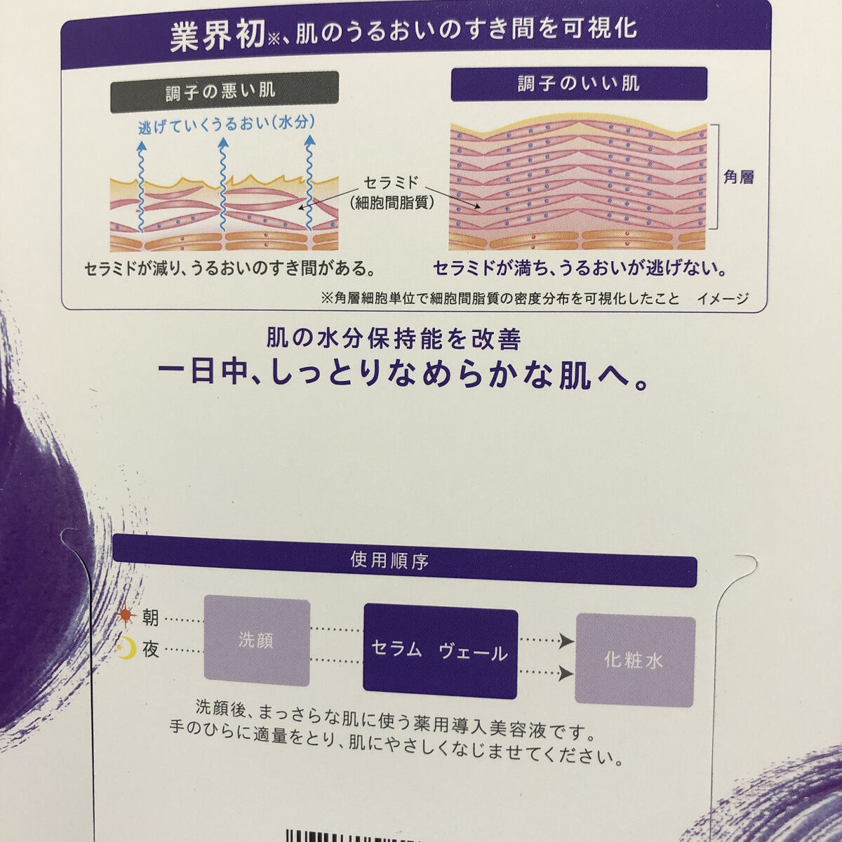 - 【医薬部外品】 肌の水分保持能をパワーアップさせ、なめらかなみずみずしいベースで次に使う化粧水のうるおいも効果的に届ける薬用導入美容液 「セラム ヴェール」は、有効成分「ライスパワー®No.11」はそのままに、「イリス根エキス」、「チョウジエキス」(保湿)を新配合。うるおいを保つ成分である「セラミド」の生成を促進し、肌の調子を整え、まるで肌がすき間のない均一な“ヴェール”に変わったかのような、うるおいが絶えまなく続くみずみずしい肌へと導きます。 肌あれ・あれ性にも効果的です。また、「インナーブースト処方 EX」を新たに採用、肌になじませた瞬間から、うるおいの効果感とともに、次に使う化粧水のうるおいも効果的に肌に届ける「薬用導入美容液」としてリニューアルします。 無着色、弱酸性、アレルギーテスト済み、パッチテスト済み、スティンギング(皮膚刺激感)テスト済み、ノンコメドジェニックテスト済み(ニキビのもとになりにくい処方)※5 です。香りは、既存品の心やすらぐグリーンフローラルの香りを踏襲しました。 ※5 すべてのかたにアレルギーや皮膚刺激が起きない、刺激感がない、コメド(ニキビのもと)ができないいというわけではありません