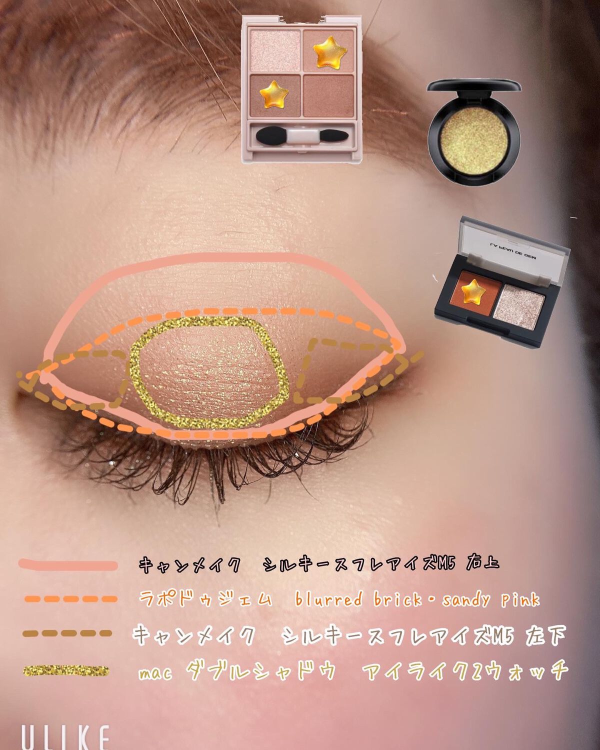 アイベースを塗った後、ウェッジを上下の瞼全体にのせる。(彫り深く見える) ウッドウィンクトを密集したブラシにとり、目の窪みまでのアイホールに磨くようにつける テンプティングを下瞼全体にのせた後、ウッドウィンクトを黒目の下にだけのせ涙袋を作る グラウンドブラウンと、エスプレッソを小さめのブラシで、黒目の上を抜かして目頭・目尻に二重幅でくの字に入れる(下目尻の1/3にも) ネイキッドランチを目頭と下瞼の目頭側にのせ抜け感をプラス! 目元が濃くなり血色感がないので、チークはピンクの偏光パールが入ったオレンジチークにして赤みのブラウンリップをつけるとバランスが取れたよっ☺️