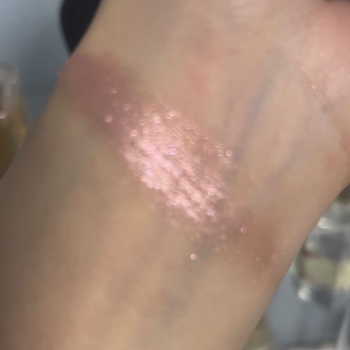 イリデッセントピンク&ゴールドスパークル。透明感のある青みピンクベースにゴールドラメが含まれていてめちゃくちゃ可愛い! 一度塗りだと淡めでキラキラ。重ねて塗ると色みが出てきます。 涙袋に使っても可愛いカラーです◡̈