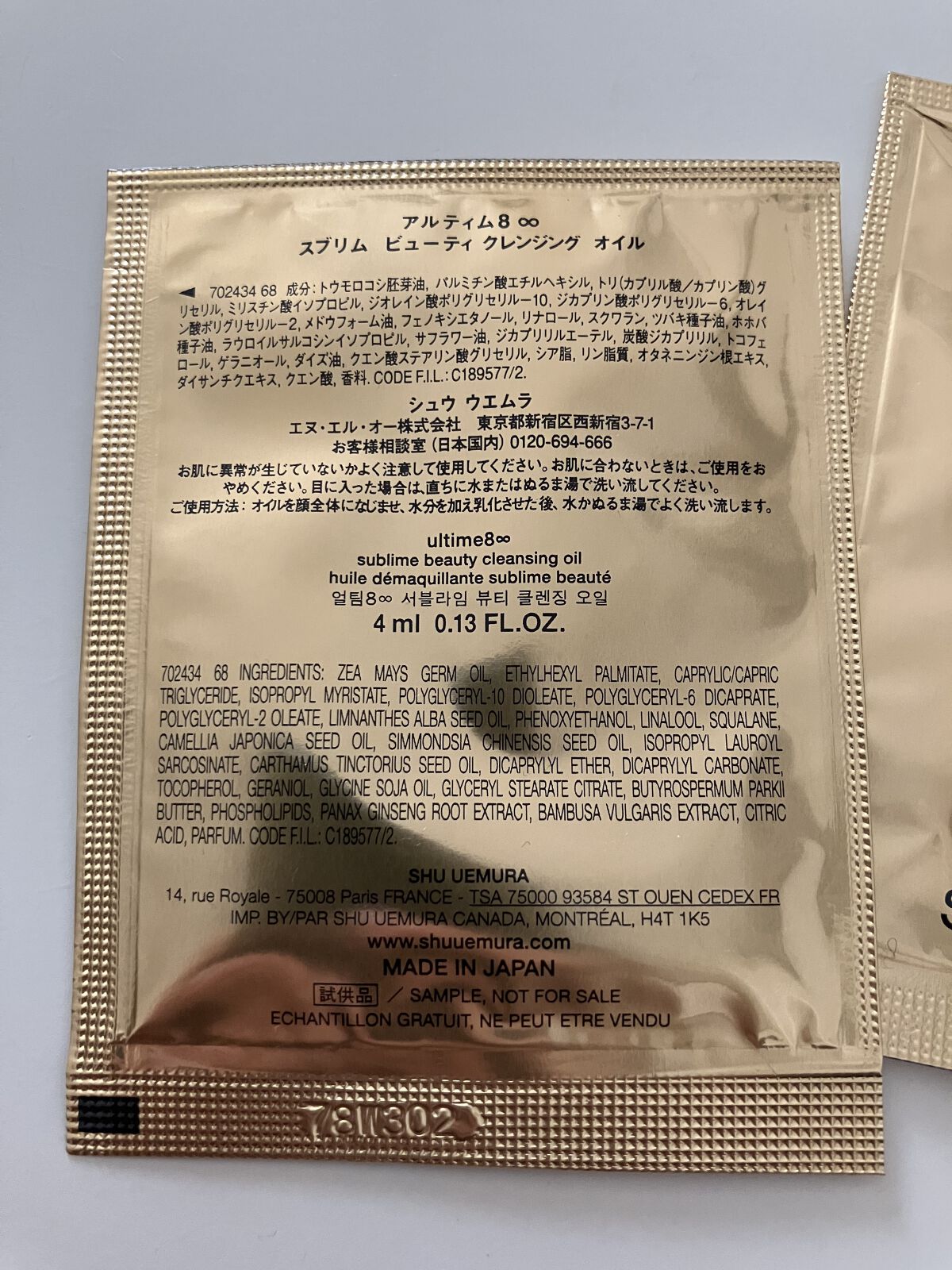 - <150ml> フェノキシエタノール、スクワラン、香料、トコフェロール、ホホバ種子油、シア脂、炭酸ジカプリリル、ツバキ種子油、パルミチン酸エチルヘキシル、クエン酸、オタネニンジン根エキス、ダイズ油、サフラワー油、メドウフォーム油、ジカプリリルエーテル、トリ(カプリル酸/カプリン酸)グリセリル、ミリスチン酸イソプロピル、オレイン酸ポリグリセリル-2、リナロール、ゲラニオール、トウモロコシ胚芽油、ジオレイン酸ポリグリセリル-10、ジカプリン酸ポリグリセリル-6、ラウロイルサルコシンイソプロピル、クエン酸ステアリン酸グリセリル、リン脂質、ダイサンチクエキス <450ml> フェノキシエタノール、スクワラン、香料、トコフェロール、ホホバ種子油、シア脂、炭酸ジカプリリル、ツバキ種子油、パルミチン酸エチルヘキシル、クエン酸、オタネニンジン根エキス、ダイズ油、サフラワー油、メドウフォーム油、ジカプリリルエーテル、トリ(カプリル酸/カプリン酸)グリセリル、ミリスチン酸イソプロピル、オレイン酸ポリグリセリル-2、リナロール、ゲラニオール、トウモロコシ胚芽油、ジオレイン酸ポリグリセリル-10、ジカプリン酸ポリグリセリル-6、ラウロイルサルコシンイソプロピル、クエン酸ステアリン酸グリセリル、リン脂質、ダイサンチクエキス <限定パッケージ150ml(シュウ ウエムラ × ジョジョ の奇妙な冒険)(限定)> フェノキシエタノール、スクワラン、香料、トコフェロール、ホホバ種子油、シア脂、炭酸ジカプリリル、ツバキ種子油、パルミチン酸エチルヘキシル、クエン酸、オタネニンジン根エキス、ダイズ油、サフラワー油、メドウフォーム油、ジカプリリルエーテル、トリ(カプリル酸/カプリン酸)グリセリル、ミリスチン酸イソプロピル、オレイン酸ポリグリセリル-2、リナロール、ゲラニオール、トウモロコシ胚芽油、ジオレイン酸ポリグリセリル-10、ジカプリン酸ポリグリセリル-6、ラウロイルサルコシンイソプロピル、クエン酸ステアリン酸グリセリル、リン脂質、ダイサンチクエキス <限定パッケージ450ml(シュウ ウエムラ × ジョジョ の奇妙な冒険)(限定)> フェノキシエタノール、スクワラン、香料、トコフェロール、ホホバ種子油、シア脂、炭酸ジカプリリル、ツバキ種子油、パルミチン酸エチルヘキシル、クエン酸、オタネニンジン根エキス、ダイズ油、サフラワー油、メドウフォーム油、ジカプリリルエーテル、トリ(カプリル酸/カプリン酸)グリセリル、ミリスチン酸イソプロピル、オレイン酸ポリグリセリル-2、リナロール、ゲラニオール、トウモロコシ胚芽油、ジオレイン酸ポリグリセリル-10、ジカプリン酸ポリグリセリル-6、ラウロイルサルコシンイソプロピル、クエン酸ステアリン酸グリセリル、リン脂質、ダイサンチクエキス