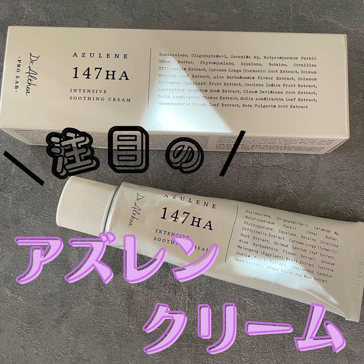 - <50ml> 水、BG、グリセリン、ジメチコン、ヒアルロン酸Na、加水分解ヒアルロン酸、フェノキシエタノール、スクワラン、シア脂、ステアリン酸、エチルヘキシルグリセリン、ツボクサエキス、DPG、ステアリン酸グリセリル、セテアリルアルコール、シクロペンタシロキサン、水添レシチン、ステアリン酸ポリグリセリル-10、セルロースガム、ポリクオタニウム-51、セラミドNP、ニオイテンジクアオイ花油、ベタイン、ポリソルベート60、(アクリル酸ヒドロキシエチル/アクリロイルジメチルタウリンNa)コポリマー、カルノシン、水添ポリイソブテン、アルガニアスピノサ核油、野菜油、セテアリルグルコシド、パンテノール、パルミチン酸、1,2-ヘキサンジオール、イソノナン酸イソノニル、ステアリン酸グリセリル(SE)、イソステアリン酸ソルビタン、トリ(カプリル酸/カプリン酸)グリセリル、水添ポリデセン、安息香酸アルキル(C12-15)、グルコース、ラウリルカルバミン酸イヌリン、結晶セルロース、センニンコク種子エキス、ステアリン酸PEG-100、ジメチコノール、シクロヘキサシロキサン、ヒノキ葉エキス、水添ポリ(C6-14オレフィン)、カミメボウキ葉エキス、β-グルカン、(C12-16)アルコール、オリーブ油脂肪酸セテアリル、オリーブ油脂肪酸ソルビタン、ナス果実エキス、メリアアザジラクタ葉エキス、メリアアザジラクタ花エキス、コクシニアインディカ果実エキス、ウコン根エキス、サンゴモエキス、ステアロイルグルタミン酸2Na、ジポリヒドロキシステアリン酸ポリグリセリル-2、マコンブエキス、ウルムスダビディアナ根エキス、グアイアズレン、タカサブロウ葉エキス、フルクトオリゴ糖、イチジク果実エキス、ビート根エキス、アロエベラ花エキス、オリゴペプチド-1、EDTA-2NA <アズレン 147HA インテンシブ モイスチャー クリーム【旧】> 水、BG、グリセリン、ジメチコン、ヒアルロン酸Na、加水分解ヒアルロン酸、フェノキシエタノール、スクワラン、シア脂、ステアリン酸、エチルヘキシルグリセリン、ツボクサエキス、DPG、ステアリン酸グリセリル、セテアリルアルコール、シクロペンタシロキサン、水添レシチン、ステアリン酸ポリグリセリル-10、セルロースガム、ポリクオタニウム-51、セラミドNP、ニオイテンジクアオイ花油、ベタイン、ポリソルベート60、(アクリル酸ヒドロキシエチル/アクリロイルジメチルタウリンNa)コポリマー、カルノシン、水添ポリイソブテン、アルガニアスピノサ核油、野菜油、セテアリルグルコシド、パンテノール、パルミチン酸、1,2-ヘキサンジオール、イソノナン酸イソノニル、ステアリン酸グリセリル(SE)、イソステアリン酸ソルビタン、トリ(カプリル酸/カプリン酸)グリセリル、水添ポリデセン、安息香酸アルキル(C12-15)、グルコース、ラウリルカルバミン酸イヌリン、結晶セルロース、センニンコク種子エキス、ステアリン酸PEG-100、ジメチコノール、シクロヘキサシロキサン、ヒノキ葉エキス、水添ポリ(C6-14オレフィン)、カミメボウキ葉エキス、β-グルカン、(C12-16)アルコール、オリーブ油脂肪酸セテアリル、オリーブ油脂肪酸ソルビタン、ナス果実エキス、メリアアザジラクタ葉エキス、メリアアザジラクタ花エキス、コクシニアインディカ果実エキス、ウコン根エキス、サンゴモエキス、ステアロイルグルタミン酸2Na、ジポリヒドロキシステアリン酸ポリグリセリル-2、マコンブエキス、ウルムスダビディアナ根エキス、グアイアズレン、タカサブロウ葉エキス、フルクトオリゴ糖、イチジク果実エキス、ビート根エキス、アロエベラ花エキス、オリゴペプチド-1、EDTA-2NA