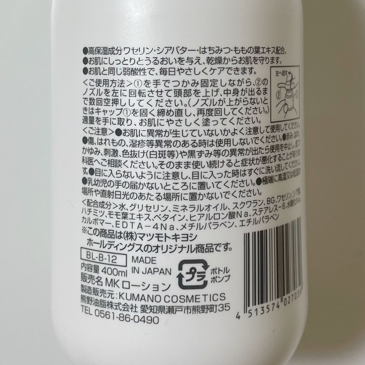 【使った商品】matsukiyo 弱酸性ボディミルク 無香料【商品の特徴】高保湿成分ワセリン・シアバター・ はちみつ・ももの葉エキス配合。 お肌にしっとりとうるおいを与え 乾燥からお肌を守ります。 ...