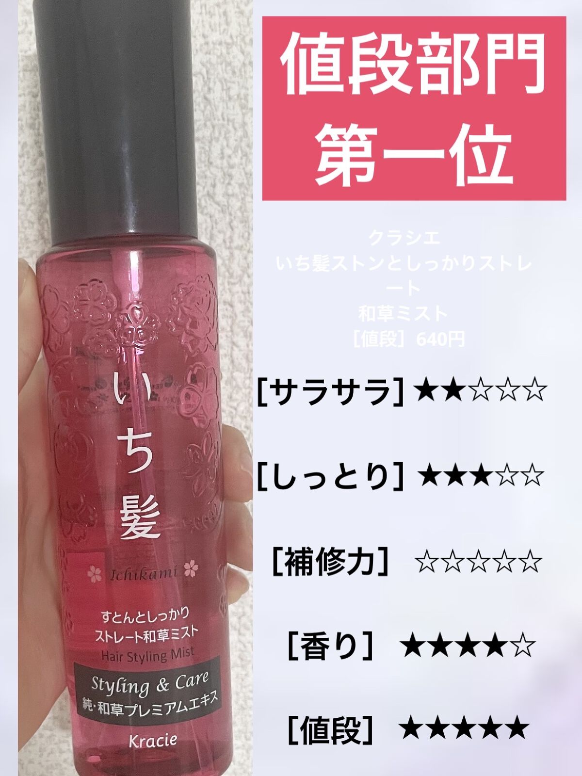 | ヘアケア・スタイリングランキング第144位 | ヘアミストなのできつすぎず、ふわ~っと優しいフローラルな匂いが漂います🍃 | 詳細を見る | |