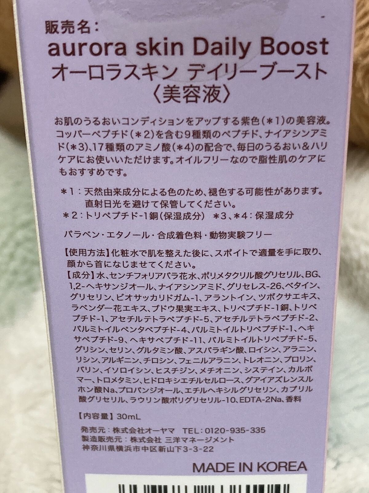 肌を整えるCICA、ナイアシンアミド、保湿成分の9種類のペプチドを配合のジェンダーレス・スキンケア美容液です。 26種類のうるおい成分配合のオイルフリー美容液なので、皮脂分泌の多いZ世代のお肌も、みずみずしい透明感のあるクリア肌に整えます。 実際に使用してみると、トロッとした薄紫色の美容液でした。伸びが良く、塗ったあとベトベトしない感じが好印象でした。 匂いはラベンダーっぽい香りが少しするくらいで、あんまり気になりませんでした。 また、1980円というお手頃な価格で購入できたこと◎