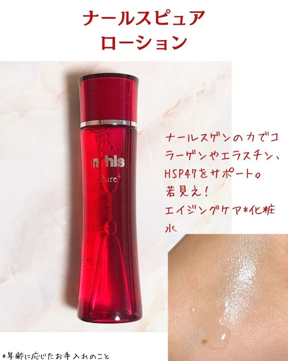 - 専門の研究機関で開発された、整肌成分ナールスゲンを推奨*1濃度で配合したエイジングケア*2化粧水。 ナールスゲンの力で肌のハリや弾力をサポート。しっとりとしたうるおいのある肌へ。ナイアシンアミド*3、APPS*3、プロテオグリカン*3、セラミドプロモーター*3、ビタミンE誘導体*3、水性保湿油配合。ハリ・弾力のある肌に導きます。界面活性剤完全フリーを実現。そんなナールスピュアでエイジングケア*2を。 *1原料メーカー推奨 *2年齢に応じたケア *3保湿成分