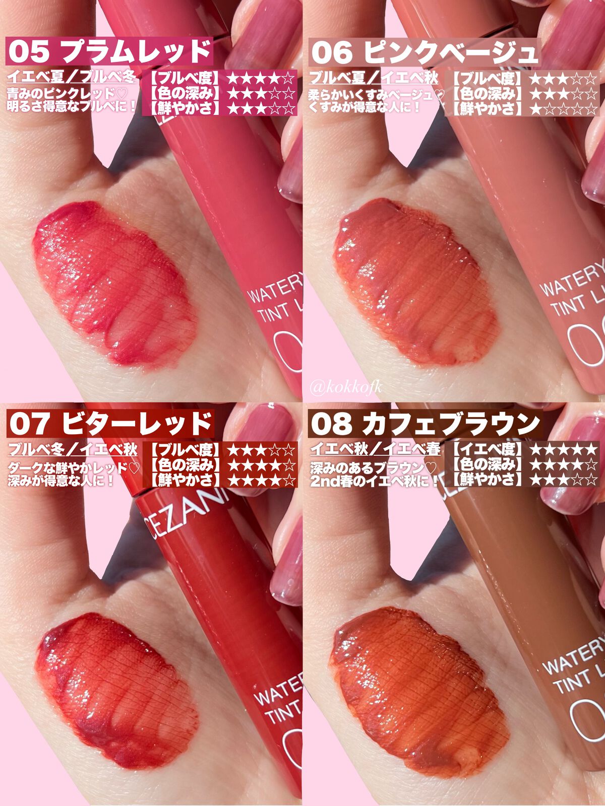 既存のジューシーラスティングティントよりさらに軽いツヤ感が魅力の新作ティント! 色選びの参考にしてね! やや黄みの明るいオレンジコーラル鮮やか得意なイエベ春におすすめ! 黄みの明るくまろやかなオレンジベージュ黄みが得意なイエベ春におすすめ! 青み黄み中間なくすみピンクベージュブルベ夏やイエベ春におすすめ 黄みの深くて鮮やかなオレンジレッド鮮やか得意なイエベ秋におすすめ! 青みの鮮やかで明るいビビッドピンク明るさ得意なブルベ冬やブルベ夏におすすめ! 青みの明るめで柔らかいローズピンクブルベ夏やブルベ冬におすすめ! 青み黄み中間な鮮やかで強いビビッドレッド2ndイエベ春のブルベ冬におすすめ! 青みの強い深くて鮮やかなベリーレッド2nd夏で鮮やか得意なブルベ冬におすすめ!