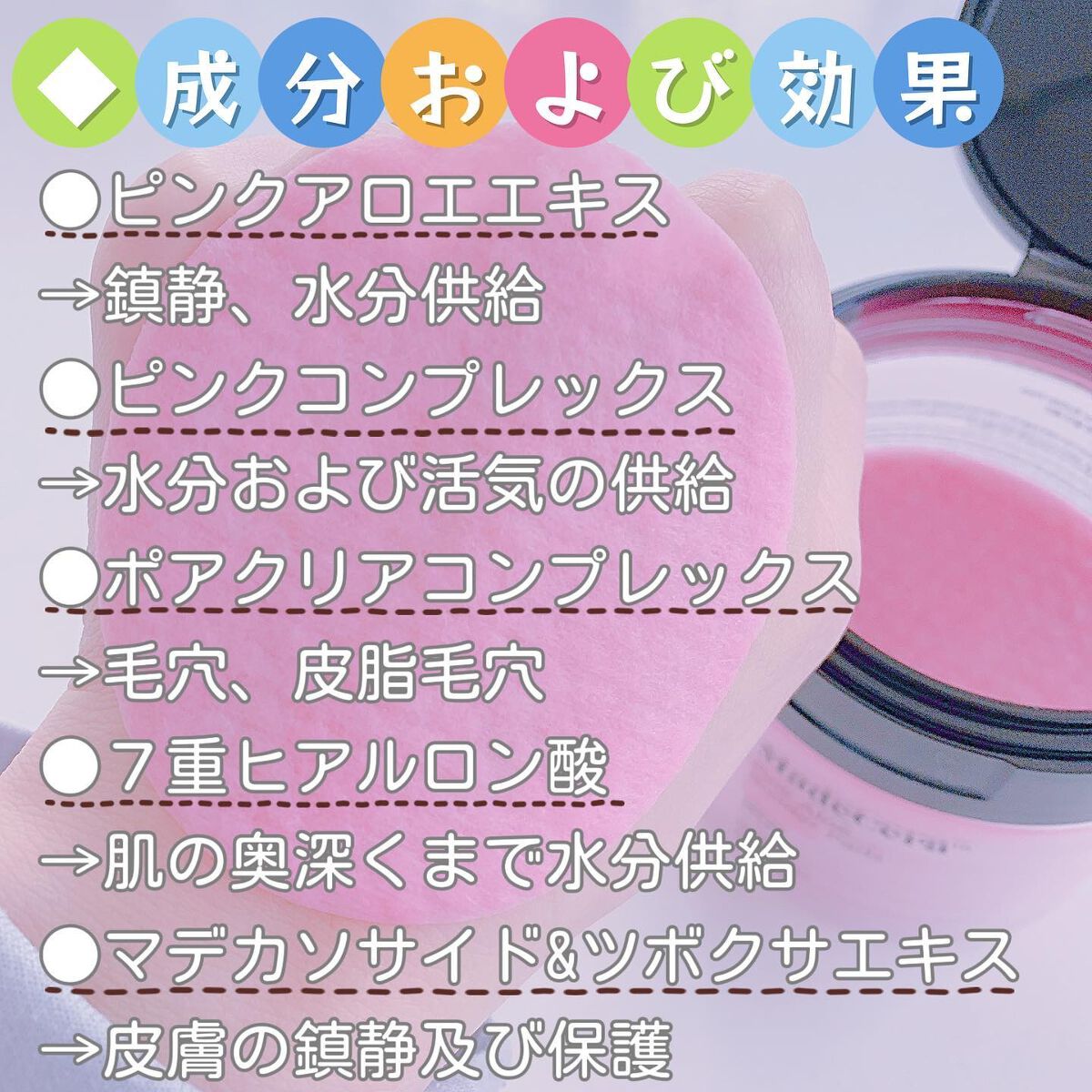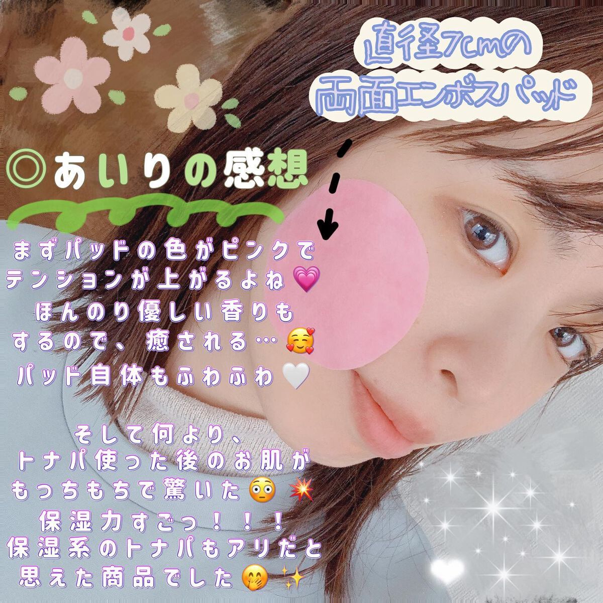 パックとしても使えるフラット面は肌のキメを優しく整えてくれるらしい。 エンボス面は洗顔で落とし切れなかった汚れや不要な角質なんかを取り除いてくれるらしい。 パッドは厚めでコットンでお手入れしているかのような満足感がちゃんとあります。 パックにした時の密着感もちゃんとあるよ🙆♀️ なにより拭き取りの時にくちゃってならないのがいい!ノンストレス✨ 見た目が可愛いから入ったパッドでしたが実力もしっかりあるよ!