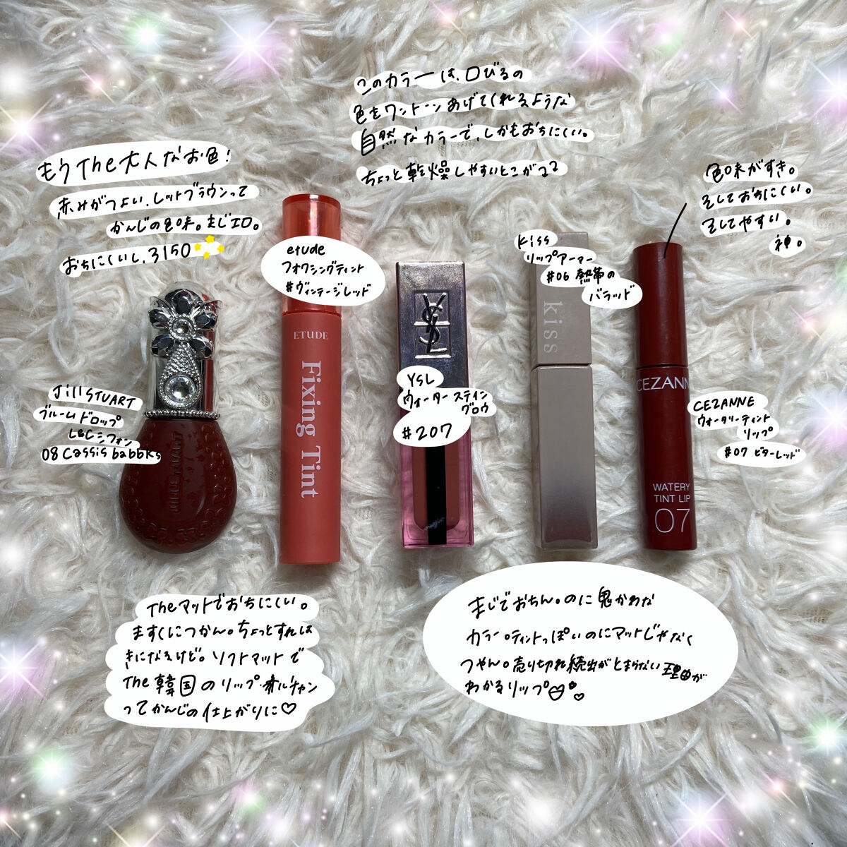 サラサラで軽い上に、ティントの役割をしっかりしてくれるリップ!サラサラでつやぷるが演出できて、尚且つティント!最高! そしていろが最高!ちょっと青みピンクみがありますが、素との唇の色に血色感をたして上げたような発色をしてくれます! この中で1番レッドみが強くて、オレンジレッド!発色がとてもいいから、ちょっとクールっぽいイメージになります!カッコイイ格好をするときとかにピッタリです! 質感はCEZANNEにそっくりだけど、アプリケーターがよりふわふわで、ぬりやすい!色持ちが良くて、落ち方がきれいだからこそみんなすきなんだなって思います!