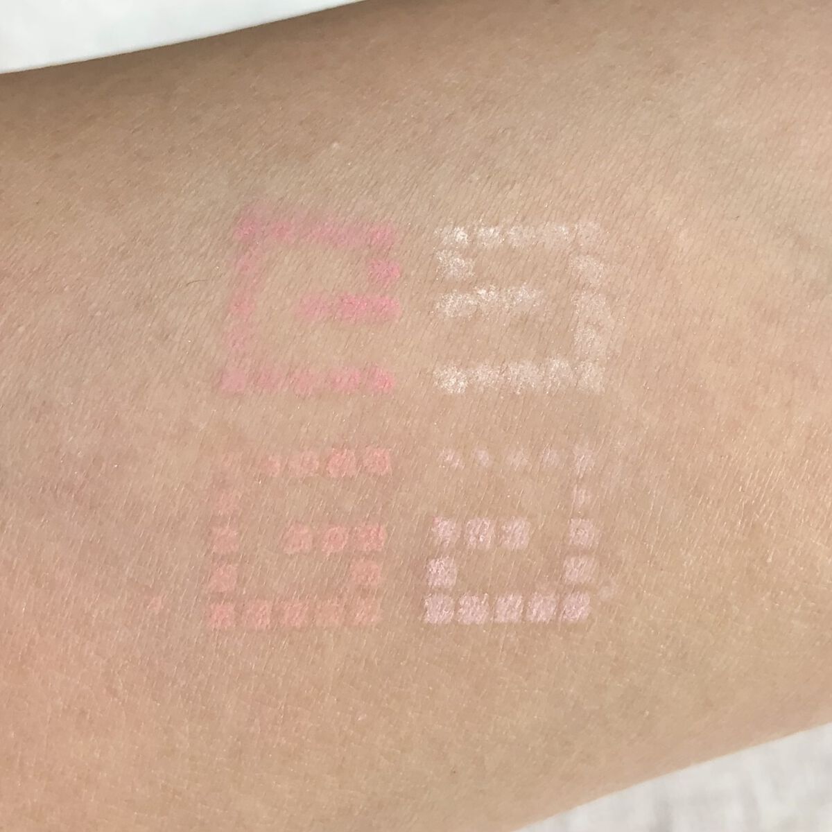全体的には、名前のとおりヌーディーな印象☺️定番色「01 本命のブラウン」と似てるんだけど、今回の「104 本能のヌードベージュ」の方が、よりヌーディーなカラーとなっておりまする💁🏻♀️ 左上のベージュカラー(1番)は、基本的にはマットカラーなんだけど、ほんのりラメも入ってるから、のっぺりとした印象にならなくて良き🥰 4番のカラーは、ハイライトとして使うこともできるし、個人的には涙袋に使っても良いのではないかと思っておりまする👻 こちらは、全体的にしっとりとしたテクスチャーとなっておりまする💖そして、上2色のマットカラーが、結構しっかり発色してくれます❣️ 右下のハイライトカラーも、「104 本能のヌードベージュ」ほど白っぽくならないので、さりげなくハイライトを入れたい人にピッタリ✨