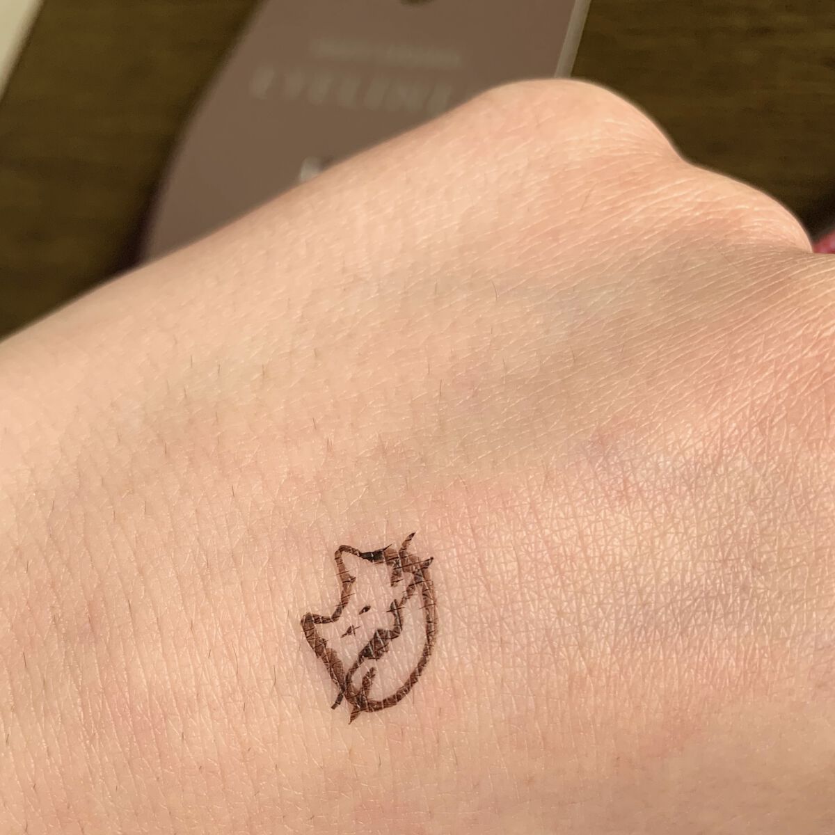 筆ペンタイプなので、描きやすいのと、太さの調節をしやすいのがいいですね。 ちょっと太めにするといいかも。 すこし手に落書きしてみましたが、スルスル描けるし、細かいところも描きやすいです。 ちょっと触ったりこすったりした程度では落ちないのもいいです。 オフも簡単です。まぶたに残ることもないです。 ブラウンブラックということで、定番の色で使い勝手も良さそうです。