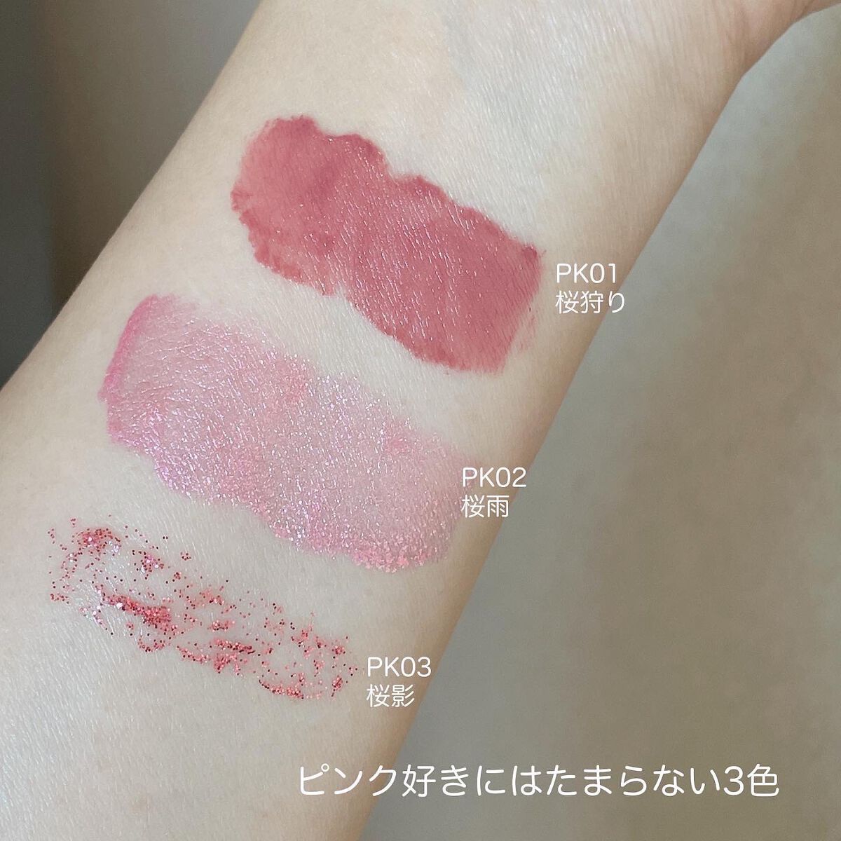 デザインがめちゃくちゃ可愛くて一目惚れ 桜のエンボス加工が春らしくて可愛い💕 ピンクだけでこんなに種類があるの?って思うぐらい色んなピンクが詰まってる♡ 全体的にブルベカラーで青みのあるピンク色が多いです♪ ラメやパール、大粒グリッターも入っていて遊び心満載🌸 これ1つでグラデーションも作れて色んなメイクが楽しめそうです♪