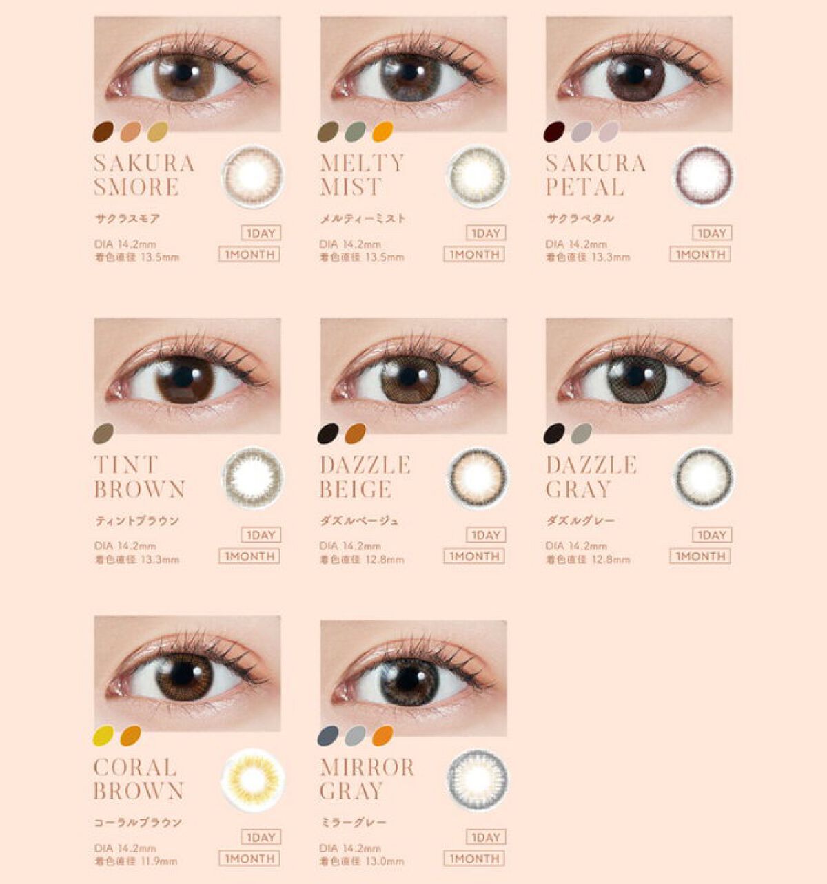 - ※2025年6月以降、商品パッケージ裏面・側面の一部表記を変更いたします。尚、これにかかる商品の交換・返品は承っておりません さりげなくいつもと違う自分をアピールしたい。 そんな女の子たちにいつまでも「いま欲しい!」と思ってもらえるレンズを目指してデザインしました。 落ち着きすぎず、明るすぎない、ナチュラルサイズで目になじみながら発色を感じられるデザインをそろえています。 カラーコンタクトレンズの不適正使用による眼障害の危険性等などがあります。 ●コンタクトレンズは高度管理医療機器です。不十分な洗浄・消毒など不適切なケアや、長時間・交換期間を超えた装用により、アレルギー性結膜炎、角膜感染症、角膜潰瘍等の重篤な眼障害が発生する危険性があります ●ご使用前に取扱説明書を確認してください 使用上の留意事項 ●眼科医院等を受診してからお求めください ●眼に異常を感じたら直ちにレンズ使用を中止し、お近くの眼科等で診察を受けてください ●医師の指示にしたがってご使用ください ●コンタクトレンズを装用する場合、自覚症状がなくても、眼科医院等での定期検査を受けてください ●レンズに不具合がある場合は使用しないでください