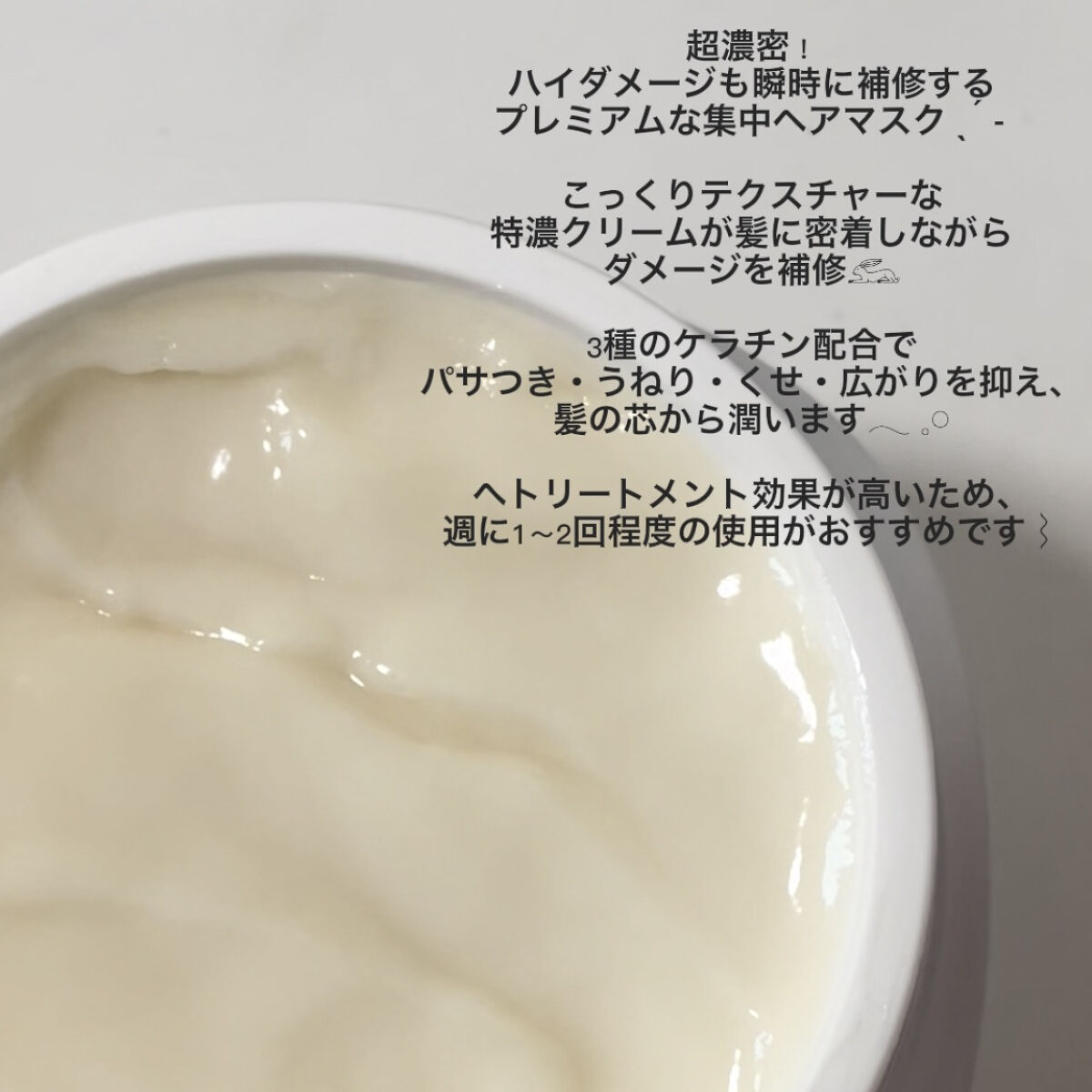 - ハイダメージも補修するプレミアムな集中ヘアマスク。こっくりとした特濃*1クリームが髪に密着して、史上最高*1のツヤ髪へ。潤いを与えてダメージも補修するオーガニックシアバター*2と、3種のケラチン*3配合で髪内部まで浸透し、特に傷んだ髪も集中補修。うねり・くせ・パサつき・広がりを抑え、芯から潤ってまとまる上質なケアを叶えます。ホワイトローズの香り。 *1 当社比 *2 シア脂(保湿) *3 加水分解ケラチン(羊毛)、加水分解ケラチン(カシミヤヤギ)、加水分解ウールキューティクルタンパク(全て保湿)