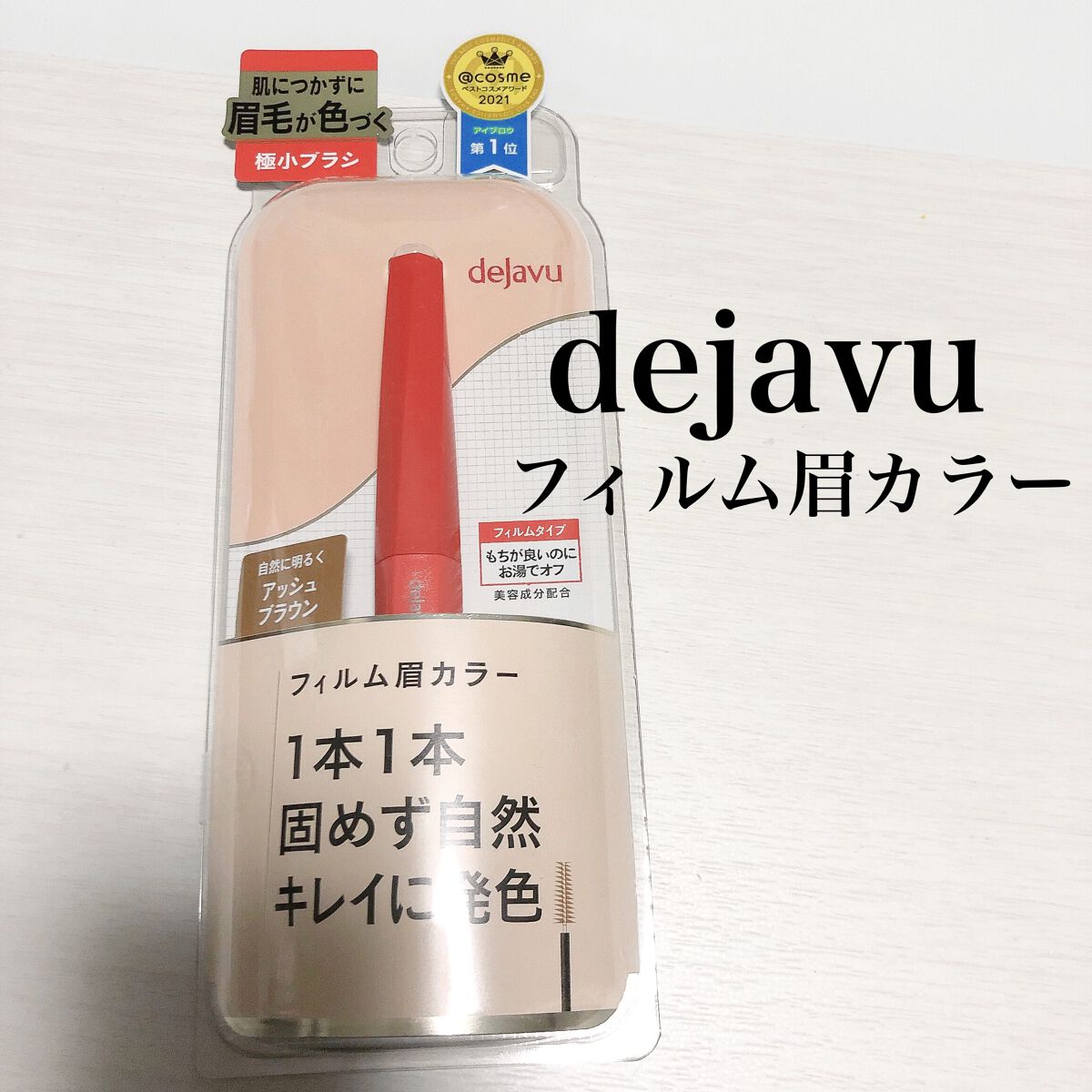 1本1本色づき固まらない「フィルム眉カラー」 塗りやすい極小ブラシで簡単垢抜け✨ デジャヴュ独自の薄膜フィルムを採用。 毛がパリッと固まらず、タバやダマのないふんわり自然な眉に。 フィルムタイプで速乾性が高く、皮脂・汗・こすれに強いのに、お湯だけで簡単に落とせます✨