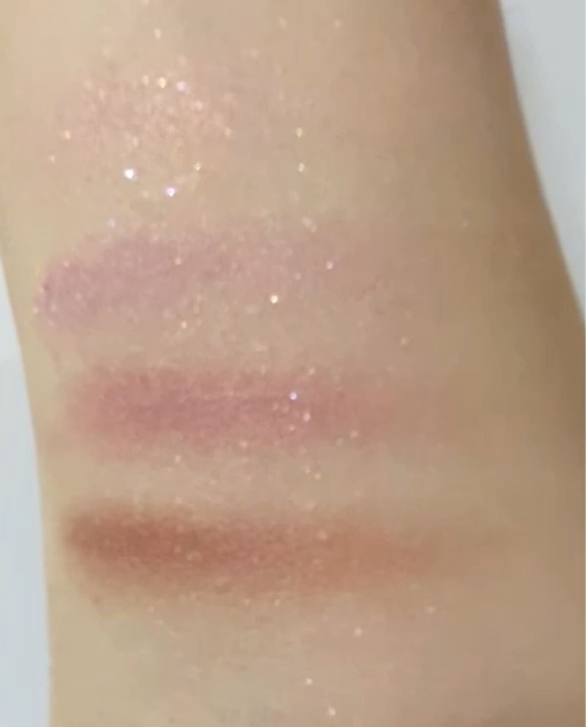 特に下3色のキラキラが信じられないくらい可愛いい煌めき𖤐˒˒ 𖤐˒˒ 𖤐˒˒ 上3色はマット。上の3色も今っぽなカラー🤎 落ち着いたピンクベージュパレットで、使いやすそう𓂃 𓈒見た目より手に出すと明るくシアーな発色。私にはこれくらいの発色が安心。
