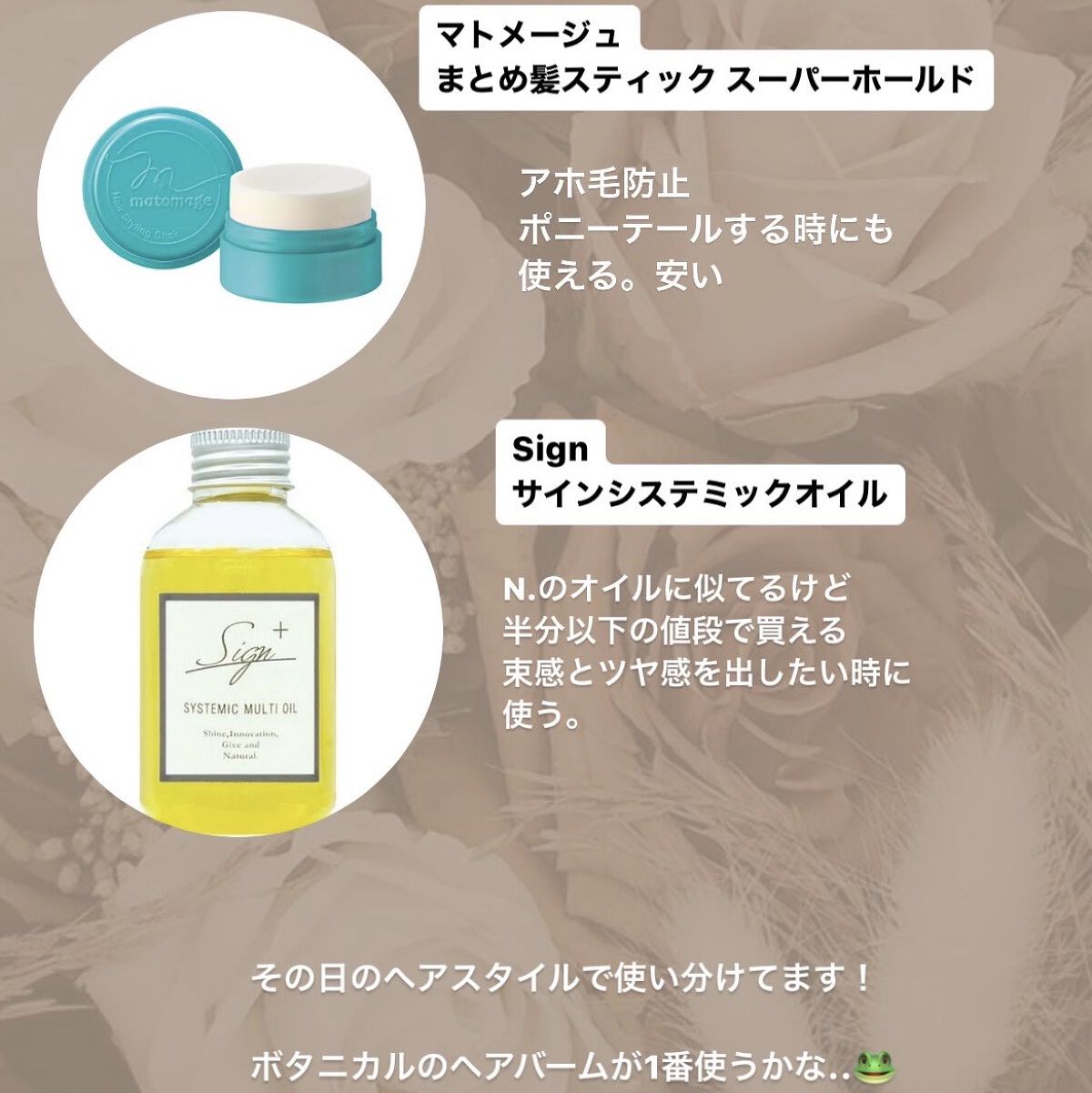 私の使ったことがあるスタイリング剤💆🏻♀️🌿Richeenparfumsennaturalbalmdaysspring美容師さんから叔母が貰い、いらないとのことで貰ったのが出会いでした😌他にもローズの香り、エキゾチックビターな香り、無香料...