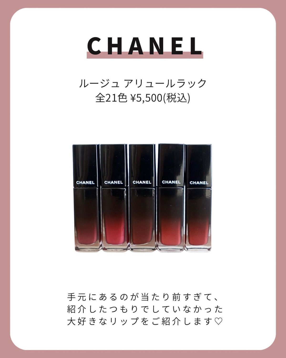 高発色で唇にピタッと密着、サテンのような艶と色持ちの良さが人気のシャネル ルージュアリュールラック✨ 定番カラー全19色をまとめました! 濃い場合はポンポン塗りで調整すると◎ 60はかなりシアーなので他のカラーに重ねて使うのがおすすめ。たっぷりのパール煌めく口元に仕上がります✨ ティントではないので荒れにくいのも嬉しいポイント◎ ぜひチェックしてみてくださいね🎄