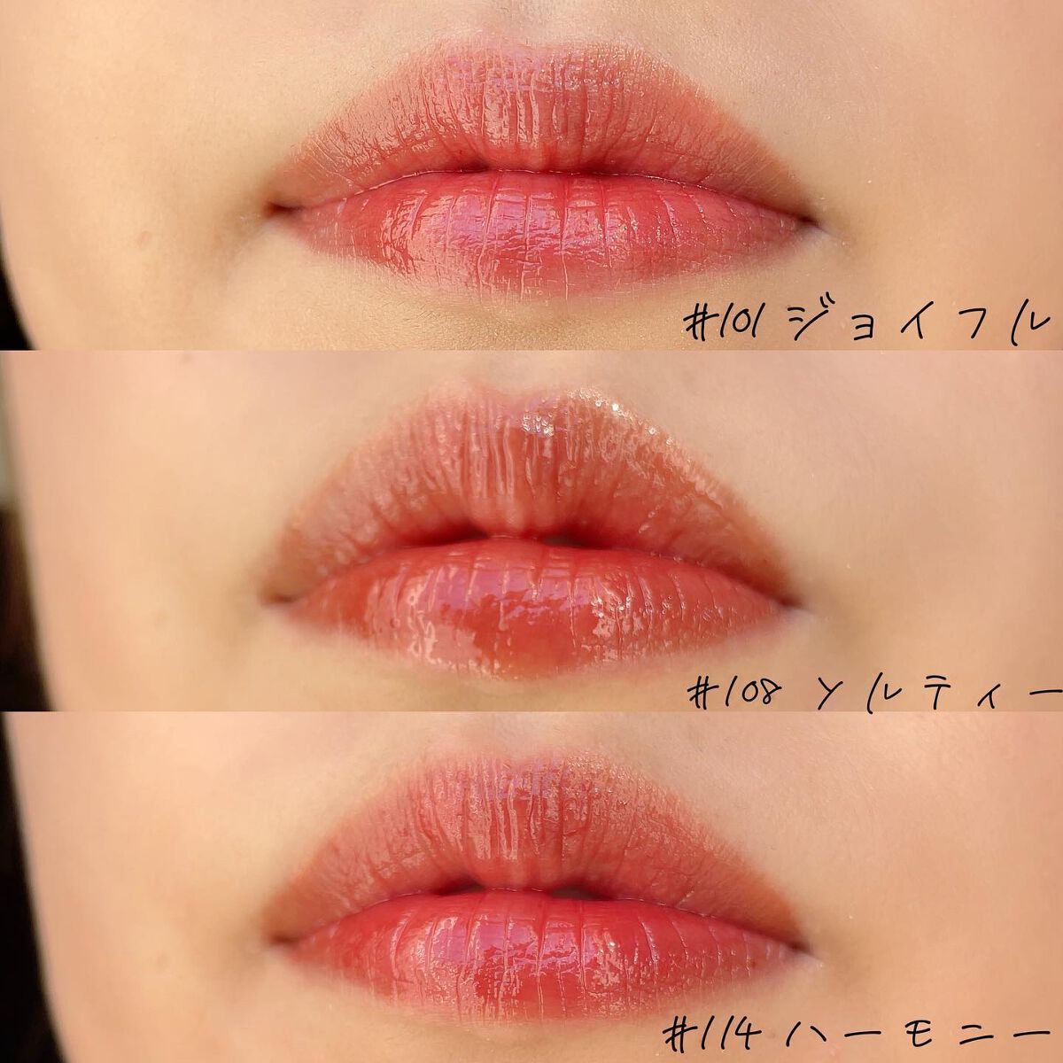 - <101 ジョイフル> 水、リンゴ酸ジイソステアリル、ダイマージリノール酸(フィトステリル/イソステアリル/セチル/ステアリル/ベヘニル)、ジイソステアリン酸ダイマージリノレイル、ノナイソステアリン酸ポリグリセリル-10、オクチルドデカノール、ビスジグリセリルポリアシルアジペート-2、水添ポリイソブテン、セチルPEG/PPG-10/1ジメチコン、ポリソルベート60(小麦由来)、イソステアリン酸ソルビタン(小麦由来)、1,2-ヘキサンジオール、グリセリン、ベヘニルアルコール、(アクリル酸/MA)コポリマーNa、ペンチレングリコール、BG、ポリアクリレート-13、トロメタミン、(アクリレーツ/アクリル酸アルキ ル(C10-30 )クロスポリマー、エチルヘキシルグリセリン、ポリイソブテン、(アクリル酸ヒドロキシエチル/アクリロイルジメチルタウリンNa)コポリマー、スクワラン、デヒドロ酢酸、ステビオシド、香料、フィチン酸、カプリリルグリコール、ジメチコン、水添ロジン酸メチル、水酸化Al、ポリソルベート20(小麦由来)、トコフェロール、ライム果汁、キイチゴ果汁、レモン果汁、マンゴー果汁、フラガリアチロエンシス果汁、アンズ果汁、オレンジ果汁、グレープフルーツ液汁、キウイ果汁、パパイア果汁、[+/-]酸化チタン、黄4、黄5、赤 104(1)、赤227、青1 <102 デューイ> 水、リンゴ酸ジイソステアリル、ダイマージリノール酸(フィトステリル/イソステアリル/セチル/ステアリル/ベヘニル)、ジイソステアリン酸ダイマージリノレイル、ノナイソステアリン酸ポリグリセリル-10、オクチルドデカノール、ビスジグリセリルポリアシルアジペート-2、水添ポリイソブテン、セチルPEG/PPG-10/1ジメチコン、ポリソルベート60(小麦由来)、イソステアリン酸ソルビタン(小麦由来)、1,2-ヘキサンジオール、グリセリン、ベヘニルアルコール、(アクリル酸/MA)コポリマーNa、ペンチレングリコール、BG、ポリアクリレート-13、トロメタミン、(アクリレーツ/アクリル酸アルキル(C10-30))クロスポリマー、エチルヘキシルグリセリン、ポリイソブテン、(アクリル酸ヒドロキシエチル/アクリロイルジメチルタウリンNa)コポリマー、スクワラン、デヒドロ酢酸、ステビオシド、香料、フィチン酸、ジメチコン、水添ロジン酸メチル、水酸化Al、カプリリルグリコール、ポリソルベート20(小麦由来)、トコフェロール、ライム果汁、キイチゴ果汁、レモン果汁、マンゴー果汁、フラガリアチロエンシス果汁、アンズ果汁、オレンジ果汁、グレープフルーツ液汁、キウイ果汁、パパイア果汁、酸化チタン、赤227、黄5、黄4、青1 <103 ハミング> 水、リンゴ酸ジイソステアリル、ダイマージリノール酸(フィトステリル/イソステアリル/セチル/ステアリル/ベヘニル)、ジイソステアリン酸ダイマージリノレイル、ノナイソステアリン酸ポリグリセリル-10、オクチルドデカノール、ビスジグリセリルポリアシルアジペート-2、水添ポリイソブテン、セチルPEG/PPG-10/1ジメチコン、ポリソルベート60(小麦由来)、イソステアリン酸ソルビタン(小麦由来)、1,2-ヘキサンジオール、グリセリン、ベヘニルアルコール、(アクリル酸/MA)コポリマーNa、ペンチレングリコール、BG、ポリアクリレート-13、トロメタミン、(アクリレーツ/アクリル酸アルキル(C10-30))クロスポリマー、エチルヘキシルグリセリン、ポリイソブテン、(アクリル酸ヒドロキシエチル/アクリロイルジメチルタウリンNa)コポリマー、スクワラン、デヒドロ酢酸、ステビオシド、香料、フィチン酸、ジメチコン、水添ロジン酸メチル、水酸化Al、カプリリルグリコール、ポリソルベート20(小麦由来)、トコフェロール、ライム果汁、キイチゴ果汁、レモン果汁、マンゴー果汁、フラガリアチロエンシス果汁、アンズ果汁、オレンジ果汁、グレープフルーツ液汁、キウイ果汁、パパイア果汁、酸化チタン、黄5、赤227、青1 <104 チェリー> 水、リンゴ酸ジイソステアリル、ダイマージリノール酸(フィトステリル/イソステアリル/セチル/ステアリル/ベヘニル)、ジイソステアリン酸ダイマージリノレイル、ノナイソステアリン酸ポリグリセリル-10、オクチルドデカノール、ビスジグリセリルポリアシルアジペート-2、水添ポリイソブテン、セチルPEG/PPG- 10/1ジメチコン、イソステアリン酸ソルビタン(小麦由来)、ポリソルベート60(小麦由来)、1,2-ヘキサンジオール、グリセリン、ベヘニルアルコール、(アクリル酸/MA)コポリマーNa、ペンチレングリコール、BG、ポリアクリレート-13、ト ロメタミン、(アクリレーツ/アクリル酸ア ルキル(C10-30))クロスポリマー、エチルヘキシルグリセリン、ポリイソブテ ン、(アクリル酸ヒドロキシエチル/アクリ ロイルジメチルタウリンNa)コポリマー、スクワラン、デヒドロ酢酸、ステビオシド、香料、カプリリルグリコール、ポリソルベー ト20(小麦由来)、トコフェロール、ライム果汁、キイチゴ果汁、レモン果汁、マンゴー 果汁、フラガリアチロエンシス果汁、アンズ 果汁、オレンジ果汁、グレープフルーツ液 汁、キウ