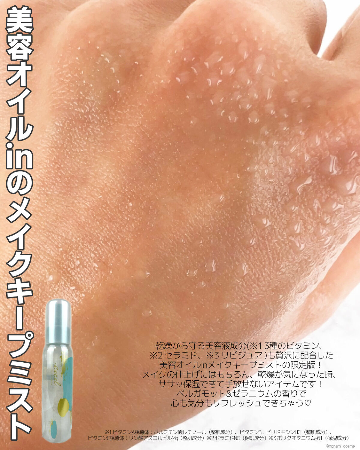 | メイクをした上にかけるミストです!粒子が細かいミストなので心地よく使えます。 | 詳細を見る | ||