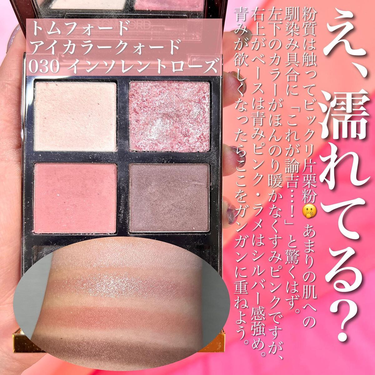 個人的にこれは絶対触ってほしい! のが「サスピション」で、大して触れてなくても肌に乗せたら「ジュワ〜…!」と発色してキラッキラン⭐️になります。 まるでこれはあれよ……ファラオ王。誰よりも権力持ってる気分になるからそんな気分の人にはガチで勧めたい🔥🔥 なんで沼る人が多いのか、一回触ったらすぐわかるのがトムフォードのアイカラークォード。是非、ボーナスが入った暁には試してみてくださいねえ〜!後悔無し!!