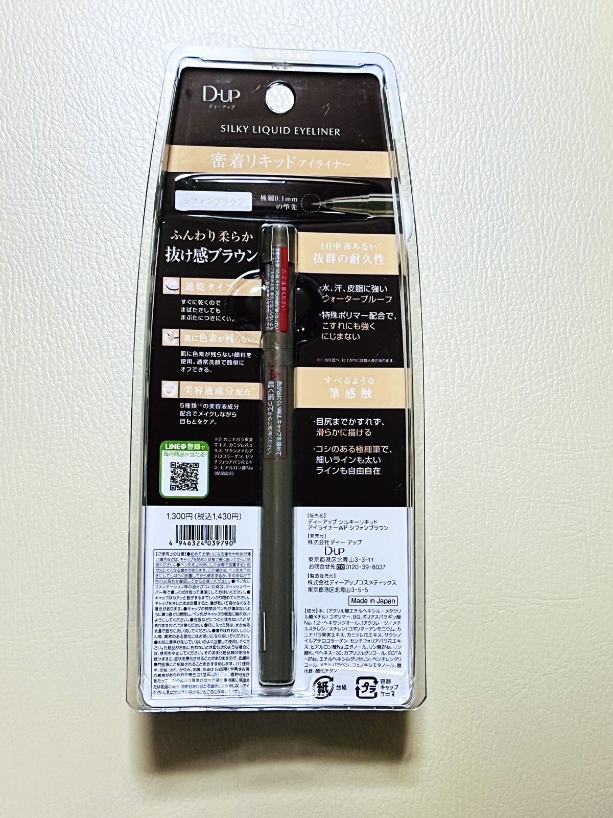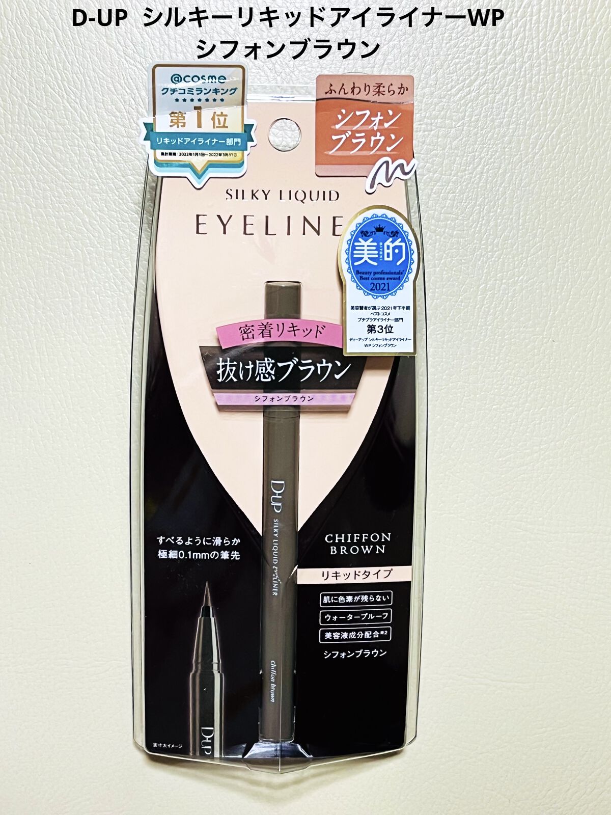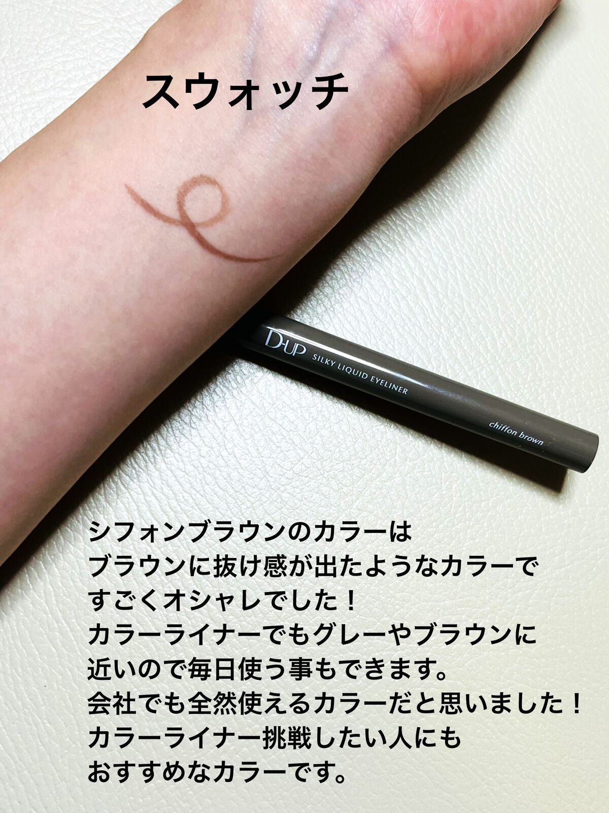 ふんわり抜け感ほしい人にぜひ試してほしいアイライナー🤎D-UPシルキーリキッドアイライナーWPシフォンブラウン0.1mmの極細筆先で太いラインも細いラインも描きやすかったです◎黒だと強く見えちゃう人でも、シフォンブラウンだとふわっと優しい印象...