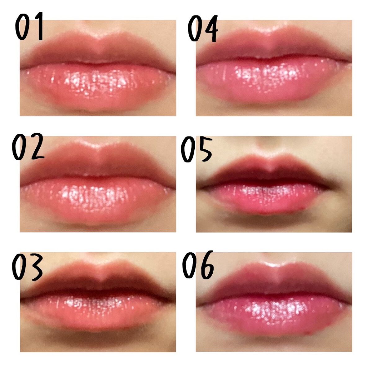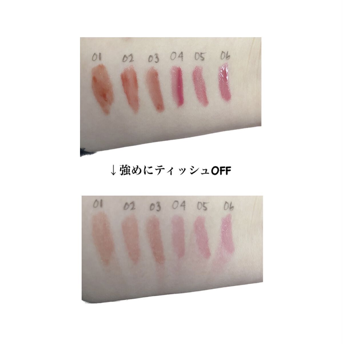 ♡ウォータリーでベタつきにくく、ツヤ感が長時間持続 ♡好みでもパーソナルカラーごとでも選べるカラーバリエーション ♡シアーな発色で、レイヤリングすることで好みの濃さに調節が簡単 まず、蓋がしっかりかちっと閉まるタイプなのが安心できてよかったです! テクスチャーはかなりもったりしているので、もちもちな唇になれます💋 乾燥やヒリヒリしてくることもなく、つけ心地がよかったです。 また、全て肌なじみのよいカラーなのでどなたでも似合うかと思います。 ちなみに個人的には02が好きでした(⑉• •⑉)❤︎ ただ若干甘い香りがするのでそこは好みが別れるかも。