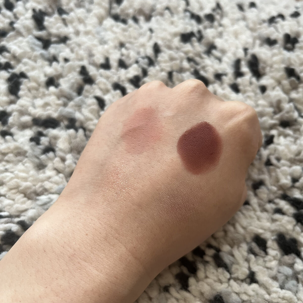 黄身も少なくグレーなので、オフィスメイクやモード系のメイクにピッタリです💄 ただラメの密着力は低いので夕方にはラメ減ります🤣 個人的に締め色をベースに塗って赤を二重幅に塗って真ん中のラメを黒目の上と下瞼に塗るのが1番しっくりきました🙆♀️ 一つのパレットでラメもハイライトが入ってるので時短したい時にも便利です! 発色が良すぎるので派手になりすぎるので最初のうちは少ないかも?と思うくらいから塗るのがおすすめです! B IDOLのピンクより彩度は高めで、発色は優しめでラメが繊細なので上品な目元にしてくれます! ただ韓国アイシャドウのような発色はないので、発色しっかりしてるのが好きな人は要検討かと🙌
