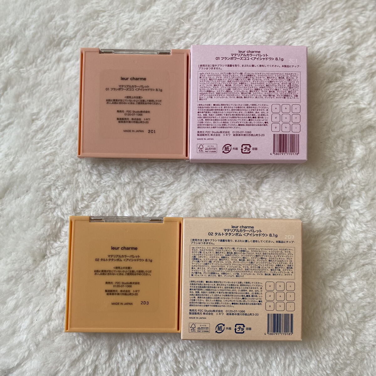 - 「ときめいて、私の瞳。」というキャッチフレーズの下、発色と質感にこだわった日本製9色アイシャドウパレット「leur charme material color palette(ルルシャルム マテリアルカラーパレット)」。2種展開で、どちらも個性的なカラーを入れつつ、絶妙な色合いやラメの使い方によって、パーソナルカラーにとらわれることなく好きな色を楽しめる構成となっています。