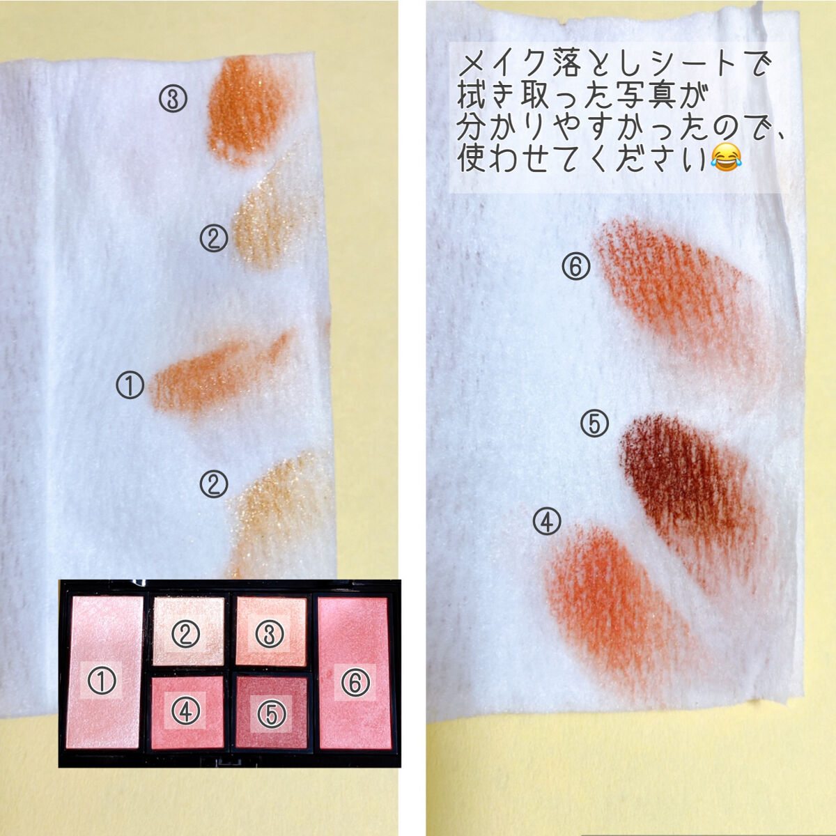 マットはかなりくすんだ色で、暗めのメイクに仕上がりがちに🤎 ツヤ感が大事だと言われるイエベ春でも、スモーキーメイク出来るんだ…!と思わせてくれたパレット。 愛して止まないミルクラテ、絶妙な柔らかベージュに透明感たっぷりのラメ✨️ 全色ラメ入りですが、真ん中2色のくすみと黄みが強く、どんよりした目元に…🥲 コーラルは大好きなんですが、このパレットは3滴白みを足したような色で、発色も弱くまぶたにも乗りづらく、かなり色白さんでないと使えない気がします…🥲 手持ちの中で1番黄み強いですが、1番完成度の高いです💕