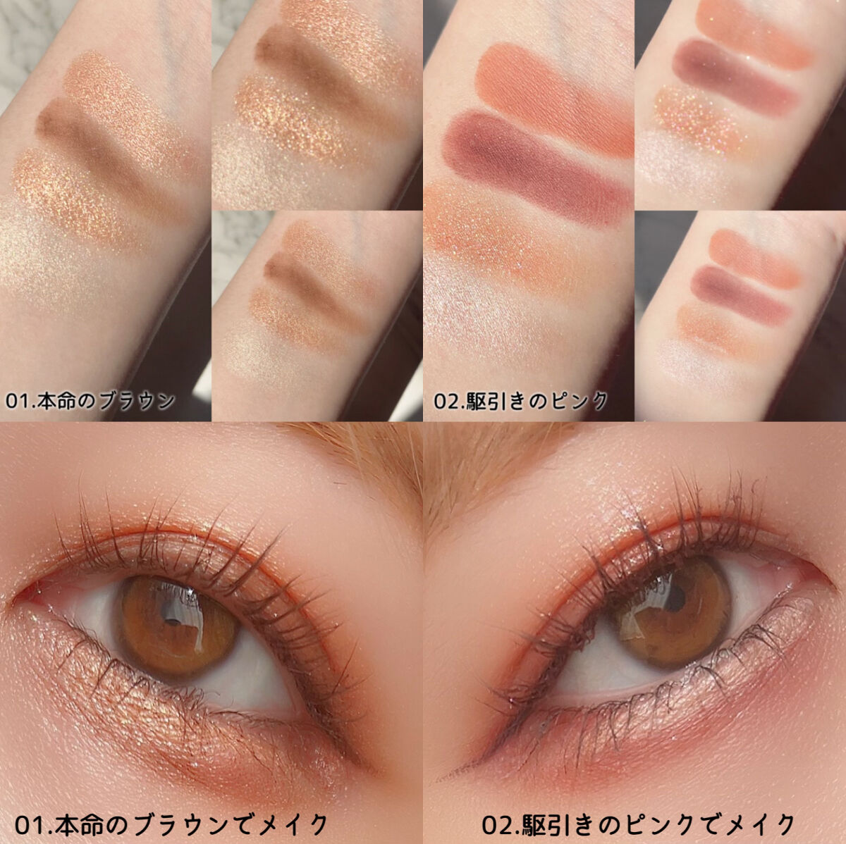 私には右側のティーローズブラウンが締め色代わり。 これと似たような発色をするアイシャドウってなんだかんだ持ってないなーと、唯一無二のプチプラアイシャドウ💕 3色どれも使いきれる自信あるくらい捨て色ないです。 660円とは思えない上品なアイメイクに仕上がります✨