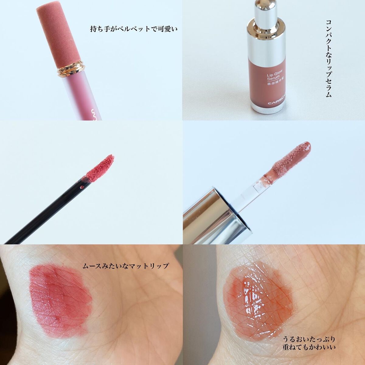 M1 ダスティローズブルベ向きのカラーでくすみ系のローズカラーです。大人っぽいカラーで、塗るとぱっと顔色が明るくなります✨ティッシュオフするとほんのりピンク色になって可愛いです♡ M2 ウォームオレンジイエベ大好きカラー黄味の強いオレンジカラーで元気が出そうな色です🍊夏のメイクにぴったり♪ 潤いマットなので、マットなリップを想像して買うと違ったイメージになるかもしれませんウォータリーティントの水っぽさもありながら少し時間が経つと染み込むようになじんでソフトマットになるので、乾燥したマットが苦手な方にはおすすめです