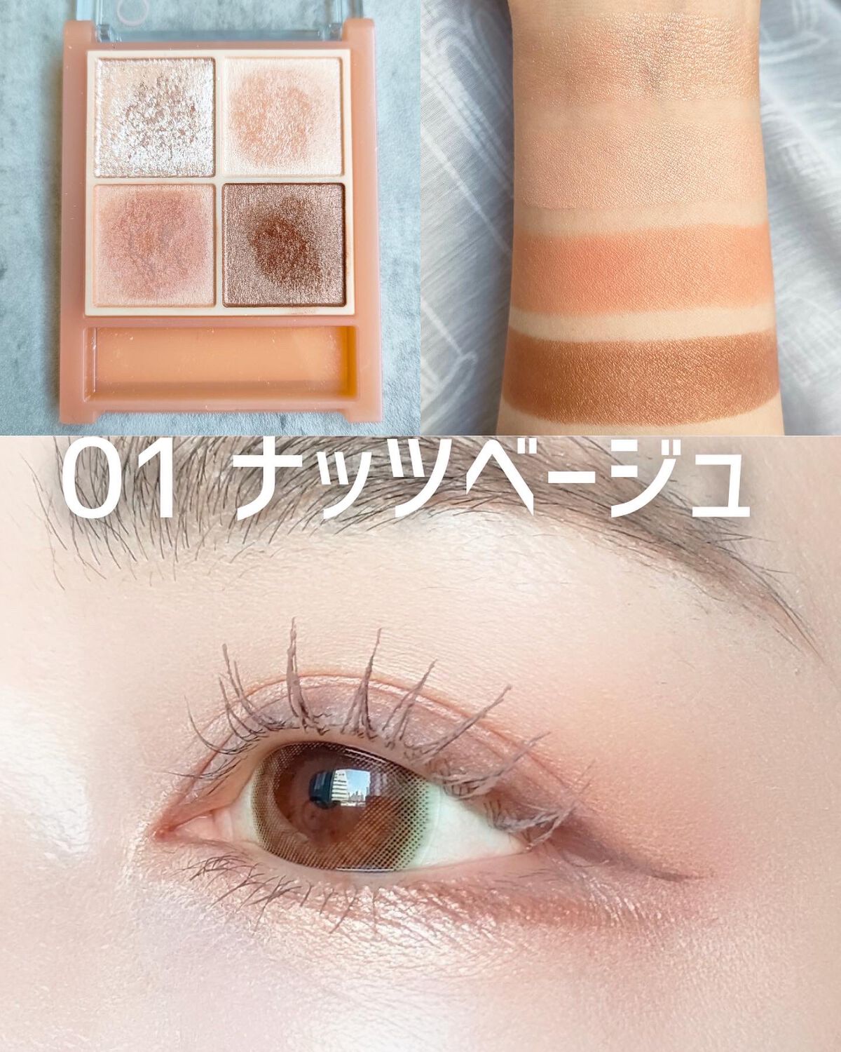 - ラメ・パール・マット3質感の4色アイシャドウ。 肌馴染みの良いベージュを基調としたカラー。ラメ・パール・マットの3質感を重ねて、自然にまぶたを強調し奥行のある大きな目元へ。 しっとり溶け込むような柔らかなパウダーなので、スルスル伸びてまぶたにピタッと密着。保湿成分(スクワラン・ホホバ種子油)配合。