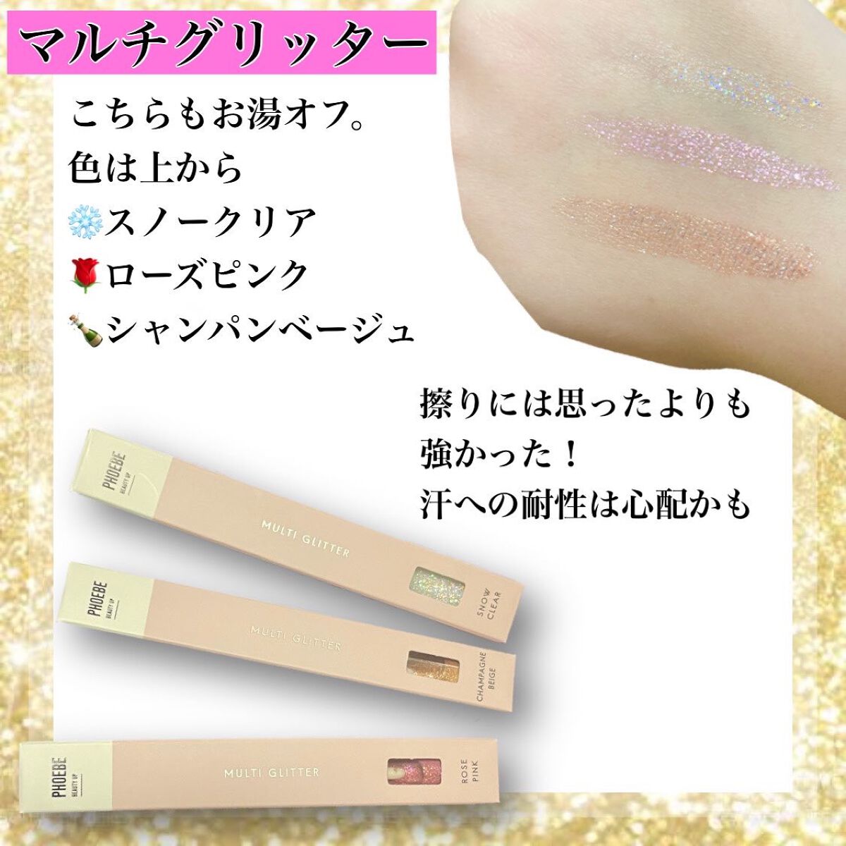 フィービーマルチグリッター✨・スノークリア・ローズピンクお湯落ちのグリッターは珍しいなと思い購入しました🌟スノークリアは色んな色に輝くラメ&パールが綺麗で角度によって輝きが変わります✨透明感のあるカラーで派手過ぎず、でも煌めきをしっかり与えて...