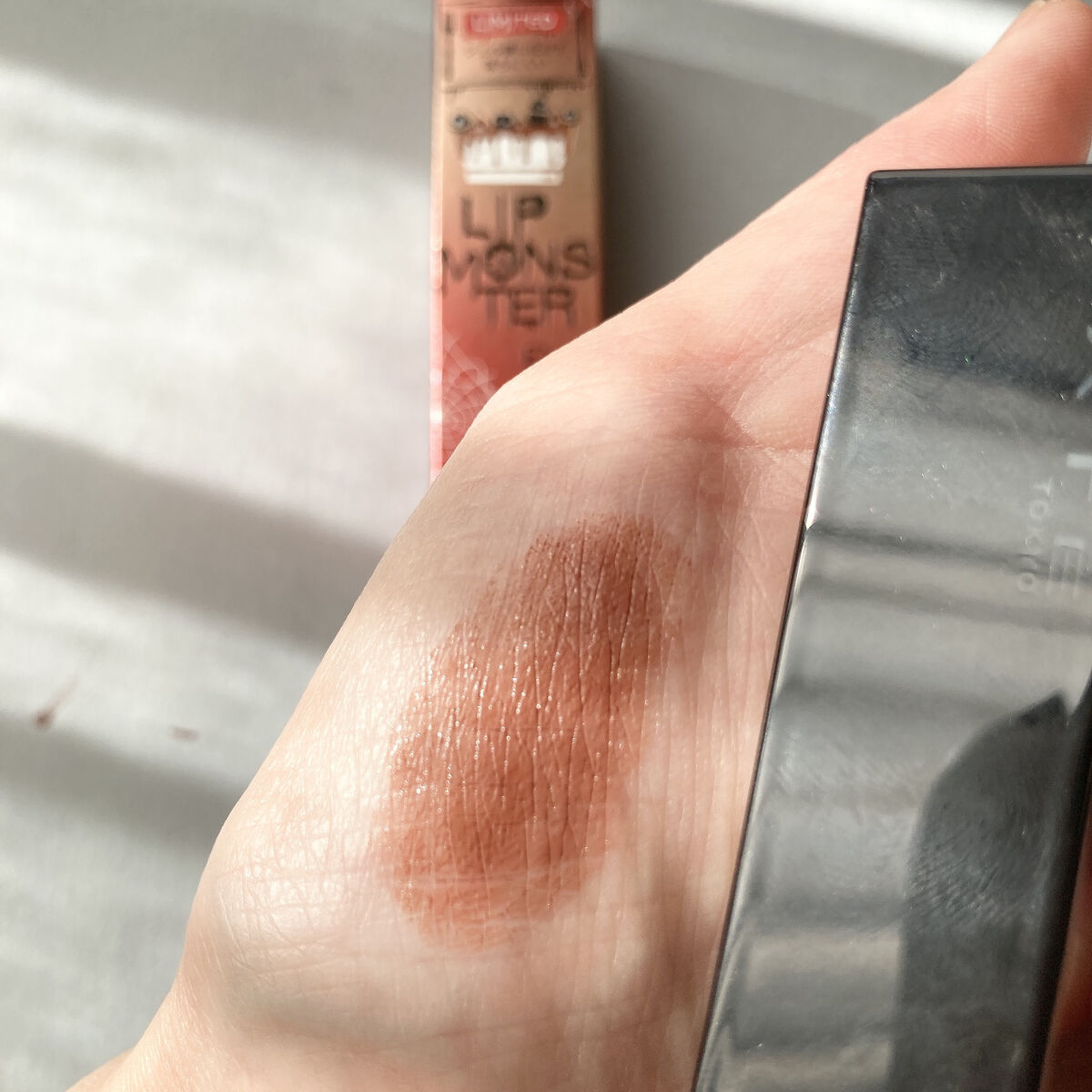 光の加減によってチョコレートカラーになったりレッドブラウンになったり不思議な絶妙カラー。 ピンクラメの他にもグリーンラメもチラチラして、なんかもうめちゃくちゃ綺麗です🥰 でもそんなにラメ感は派手でなく、自然。 見た目以上にニュアンス発色なのでメイクに深みを出したいときにちょい足しするにも便利◎ さらっとした粉質は好き嫌いがわかれそうですが、個人的にはぼかしやすくて好き👏