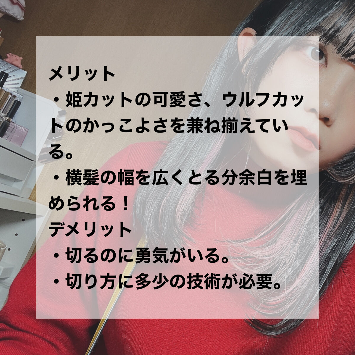 エラ張り顔さんやベース型さんってどんな触覚を作ったらいいか迷いませんか? せっかく触覚をら作るなら可愛いのを作りたいなということで姫カットを検討してみるも、姫カットが似合うのは丸顔さんや卵型さんでベース型さんにはあまり似合わないとのことで悲しくなりました。 そこで私は姫カットとウルフカットを合わせた触覚を身をもって試してみようと勢いで切りました✂ ウルフのかっこよさもあるし、姫カットの可愛さもあるいいとこ取りの髪型だと思います!