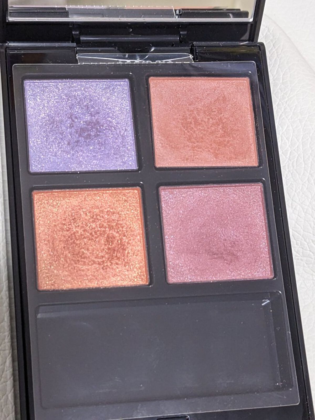 手に取ったお色は右から、パレットの①左上、②右上、③左下、④右下の順で全色ラメ入り、②④はラメ控えめ。 明るすぎない落ち着いた色なのに濁ってなくて重ね塗りしやすく綺麗なグラデが簡単にできました✨ 何かしら共通項がある色同士なので(オレンジ、ピンク、パープル)夕焼けメイク以外の組み合わせでも楽チンで使いやすく、オレンジで元気にも、ボルドーで女らしくもいけてすごくお得なパレット😂 イエベブルベ込みの色味で、濃さの調整次第で全タイプの人が使えそうな色と感じました🥰