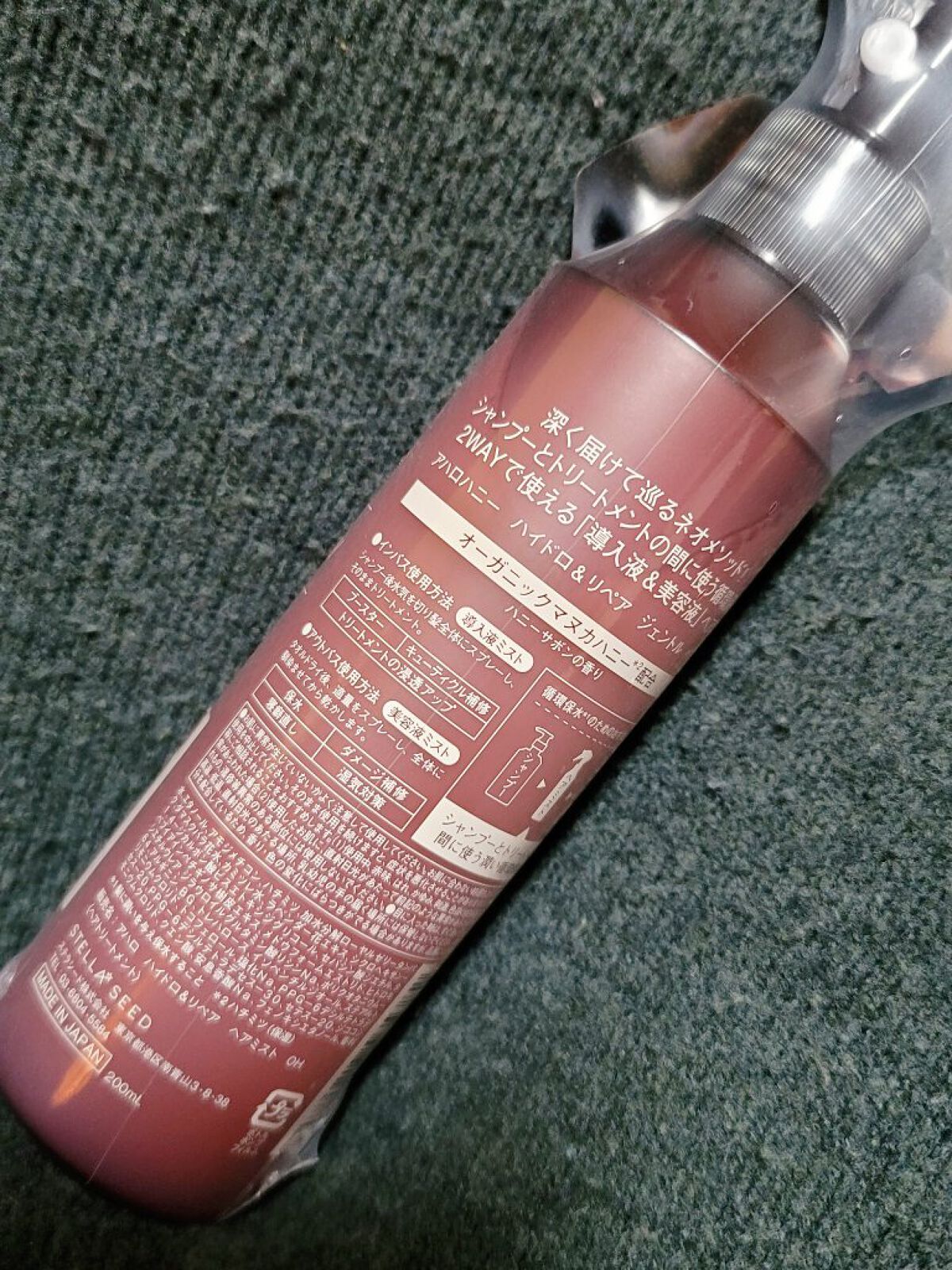 - 水、エタノール、アモジメチコン、ハチミツ、加水分解ローヤルゼリータンパク、ダマスクバラ花水、カミツレ水、ラベンダー花エキス、シクロヘキサン-1,4-ジカルボン酸ビスエトキシジグリコール、セバシン酸ジエチル、タベブイアインペチギノサ樹皮エキス、メドウフォームエストリド、ヒドロキシエチルウレア、ジラウロイルグルタミン酸リシンNa、ポリクオタニウム-64、アルギニン、BG、トレハロース、イソペンチルジオール、ステアルトリモニウムクロリド、トコフェロール、塩化Na、PPG-6デシルテトラデセス-20、PPG-6デシルテトラデセス-30、セテス-20、ジココジモニウムクロリド、クエン酸、安息香酸Na、フェノキシエタノール、香料